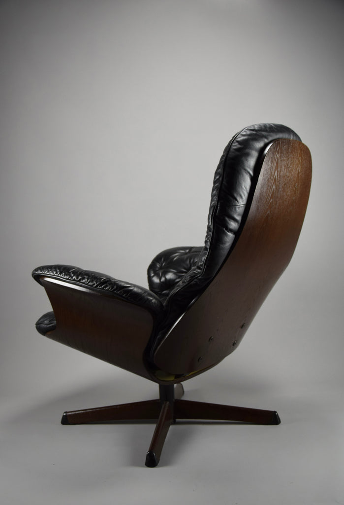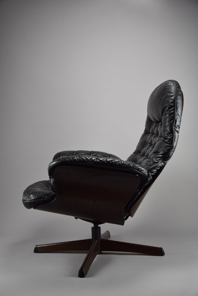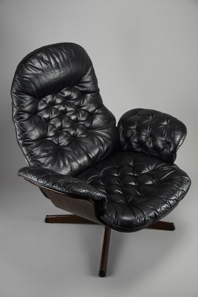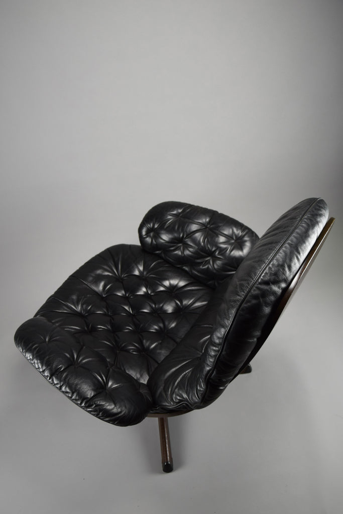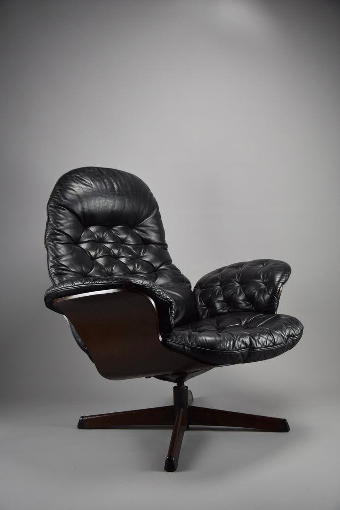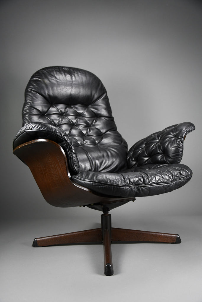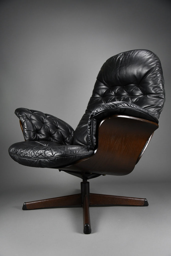 Mid-Century Modern Swedish Black Leather Swivel Lounge Chair
