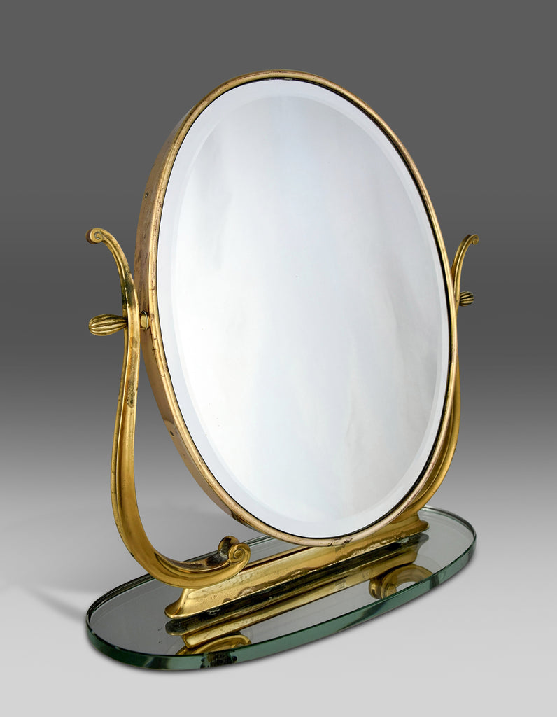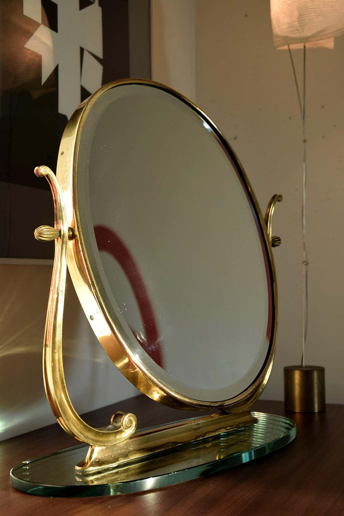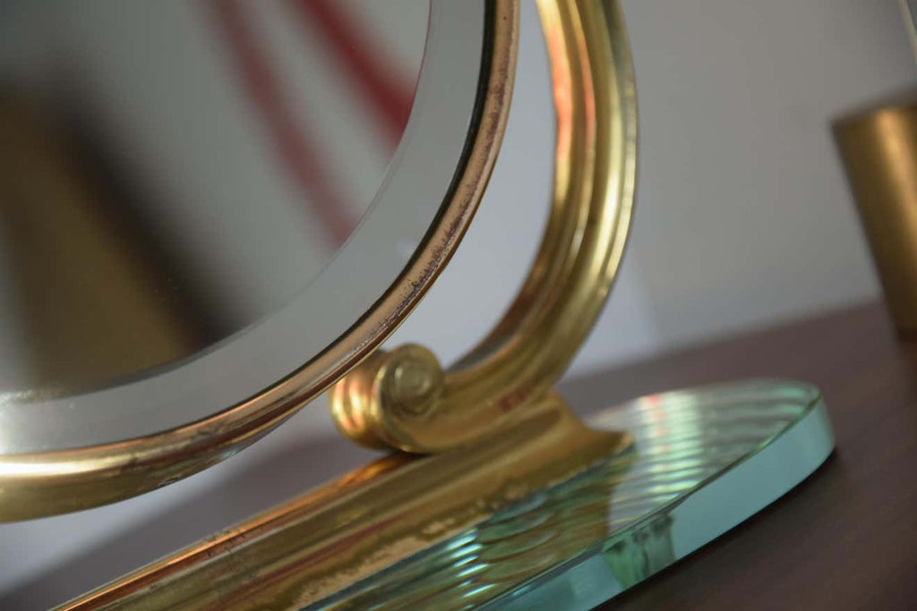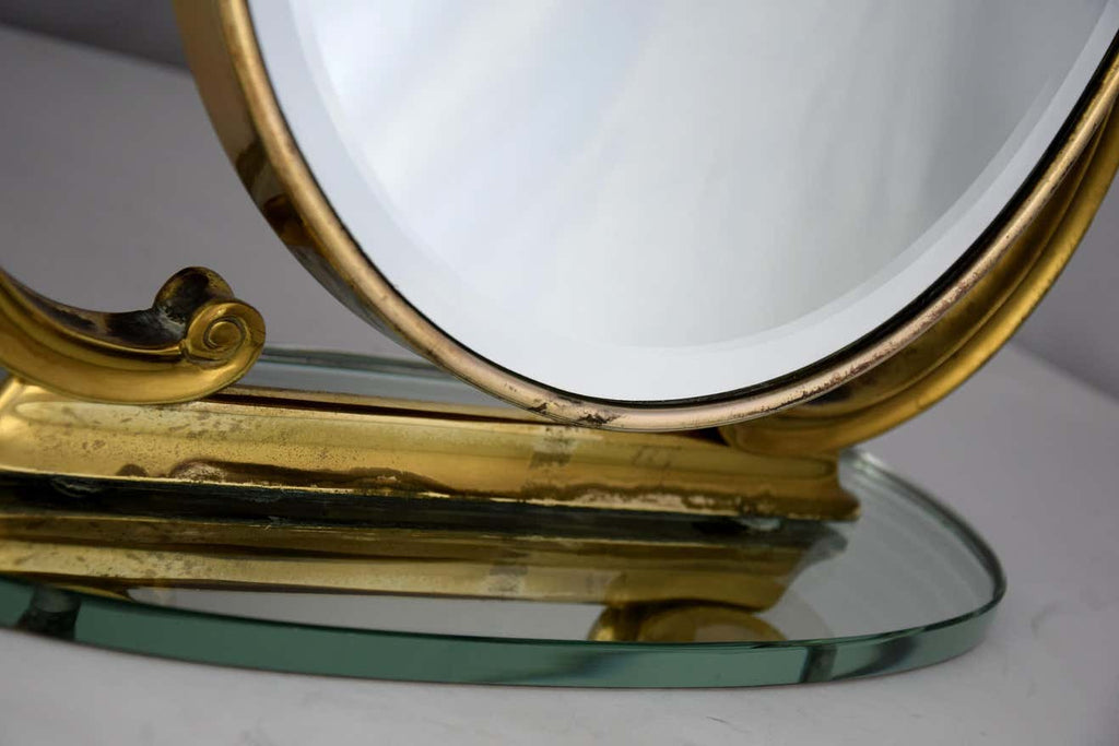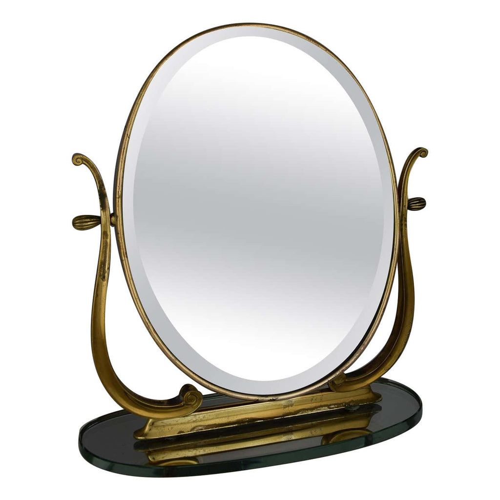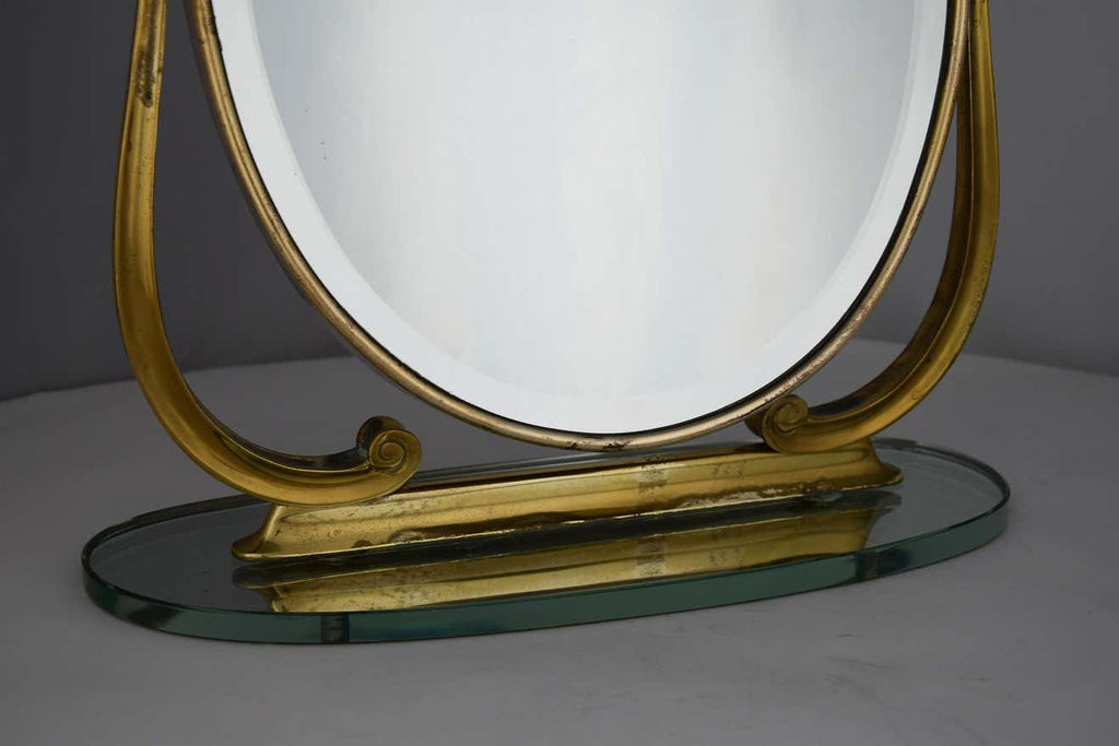 Step back into the glamorous era of the 1940s with this exquisite Italian brass and glass tabletop or vanity mirror. Crafted with meticulous attention to detail, this mirror is not just a reflection of your beauty but a testament to sophisticated design and superior craftsmanship.