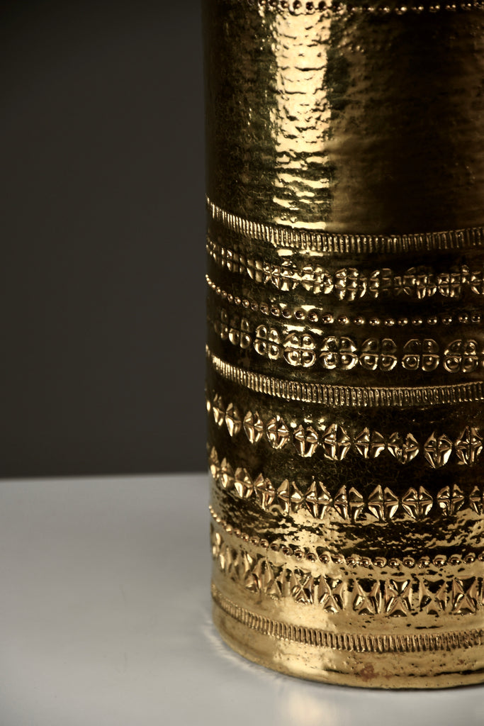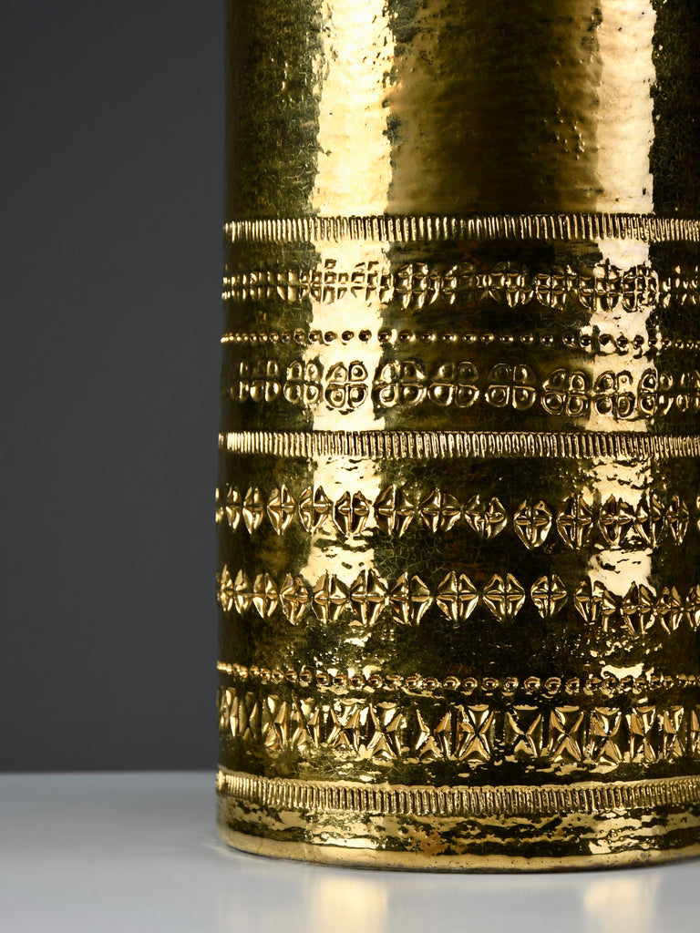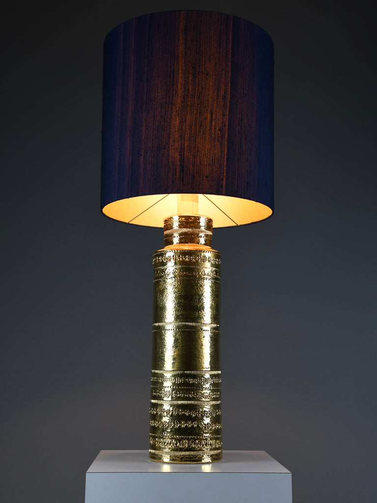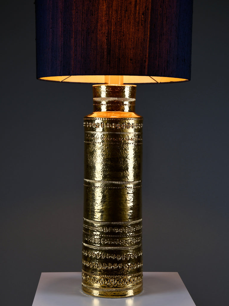 The lamp features a richly textured cylindrical ceramic base finished in brilliant gold glaze, intricately incised and stamped with Londiās signature geometric and floral motifs. The surface plays beautifully with the light, creating a captivating, tactile elegance. This example is in excellent original condition, professionally rewired, and topped with a bespoke, handcrafted lampshade in a deep-toned textile, perfectly complementing the warm gold body.
