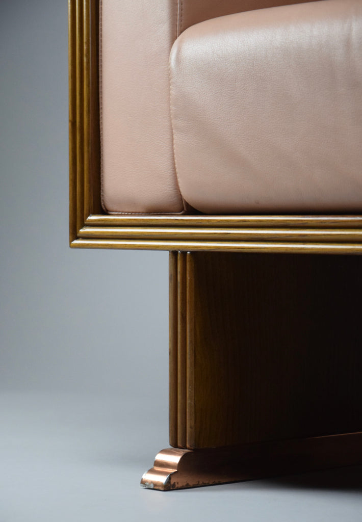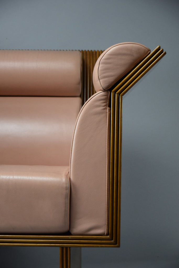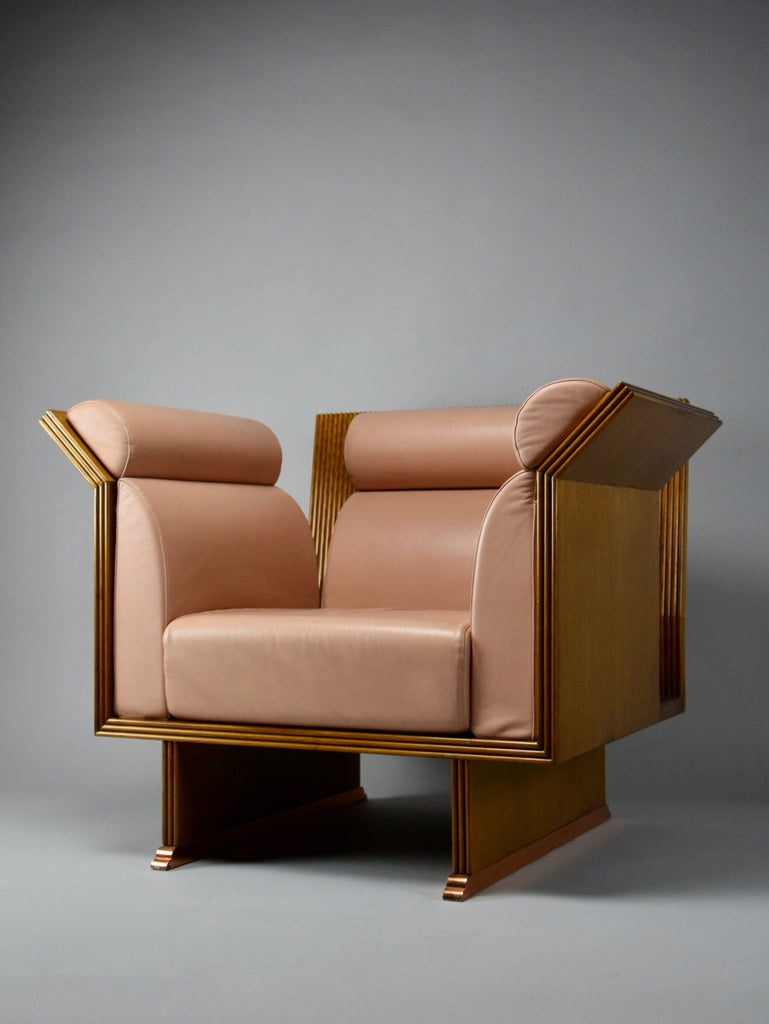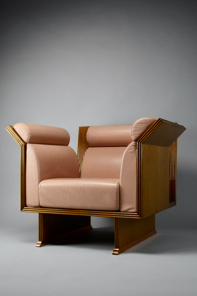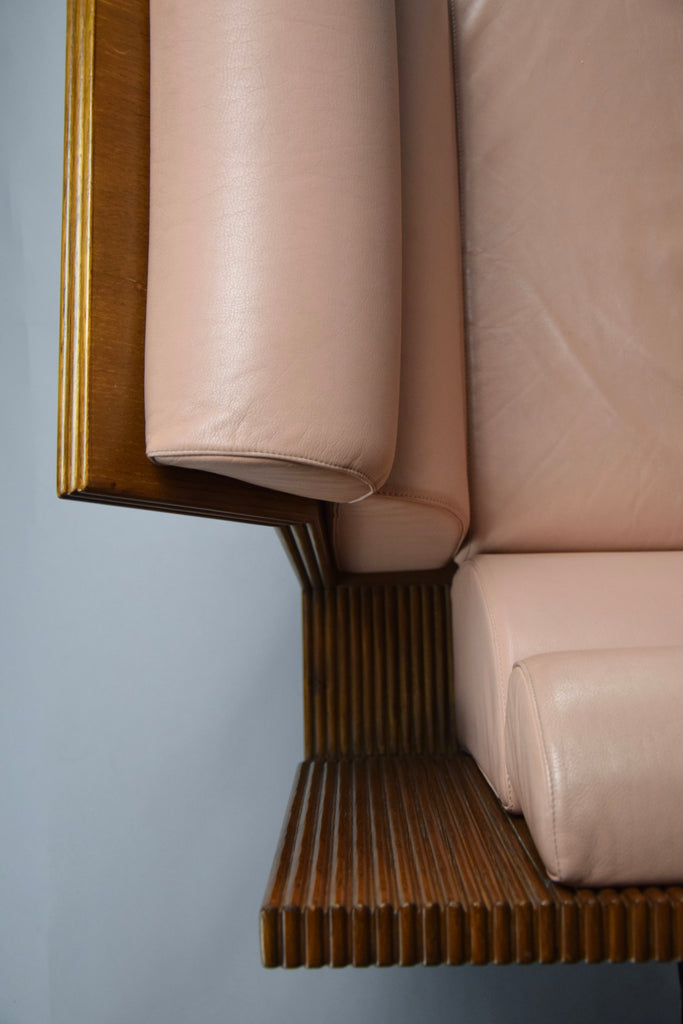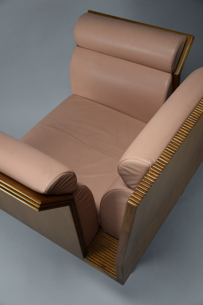 This neo eclectic post modern lounge chair is the epitome of elegance and sophistication, with it's sleek Jatoba wooden frame and gorgeous salmon-colored leather upholstery.
