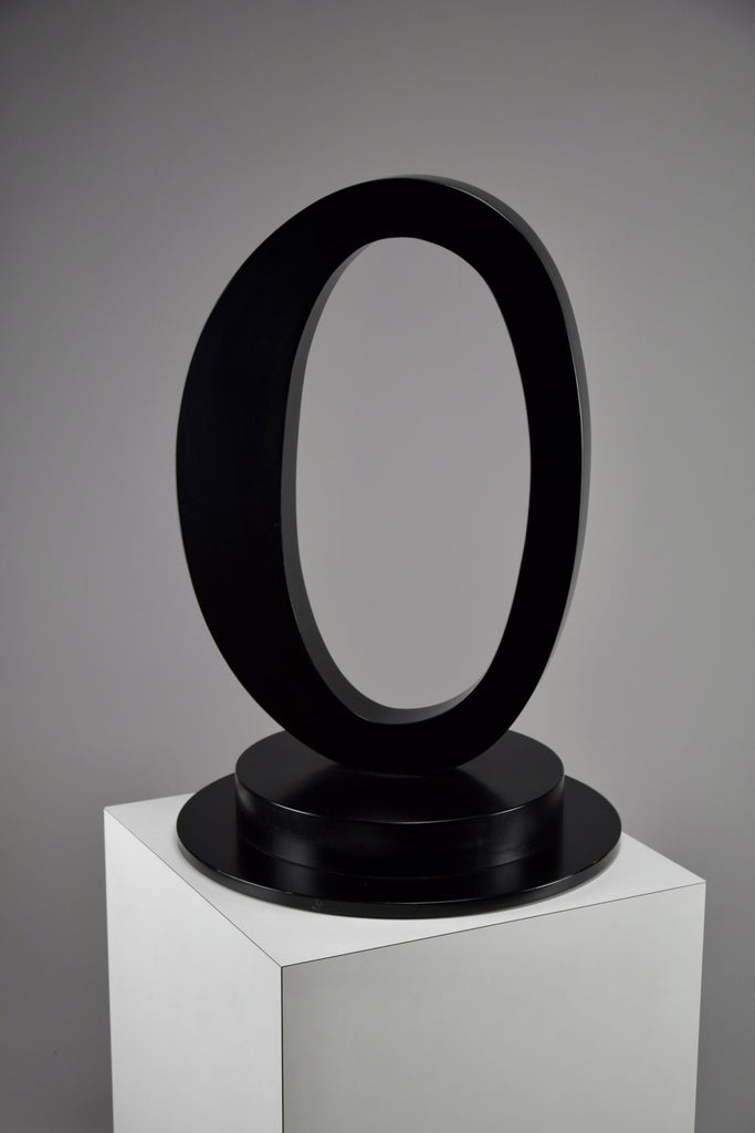 Introducing "Omni," a striking wooden sculpture crafted in Italy during the 1990s. Painted in a deep, elegant black, this piece stands as a bold statement of minimalist design and exceptional craftsmanship. With a diameter of 40 cm and a height of 58 cm, "Omni" is a versatile work of art that can transform any space.
