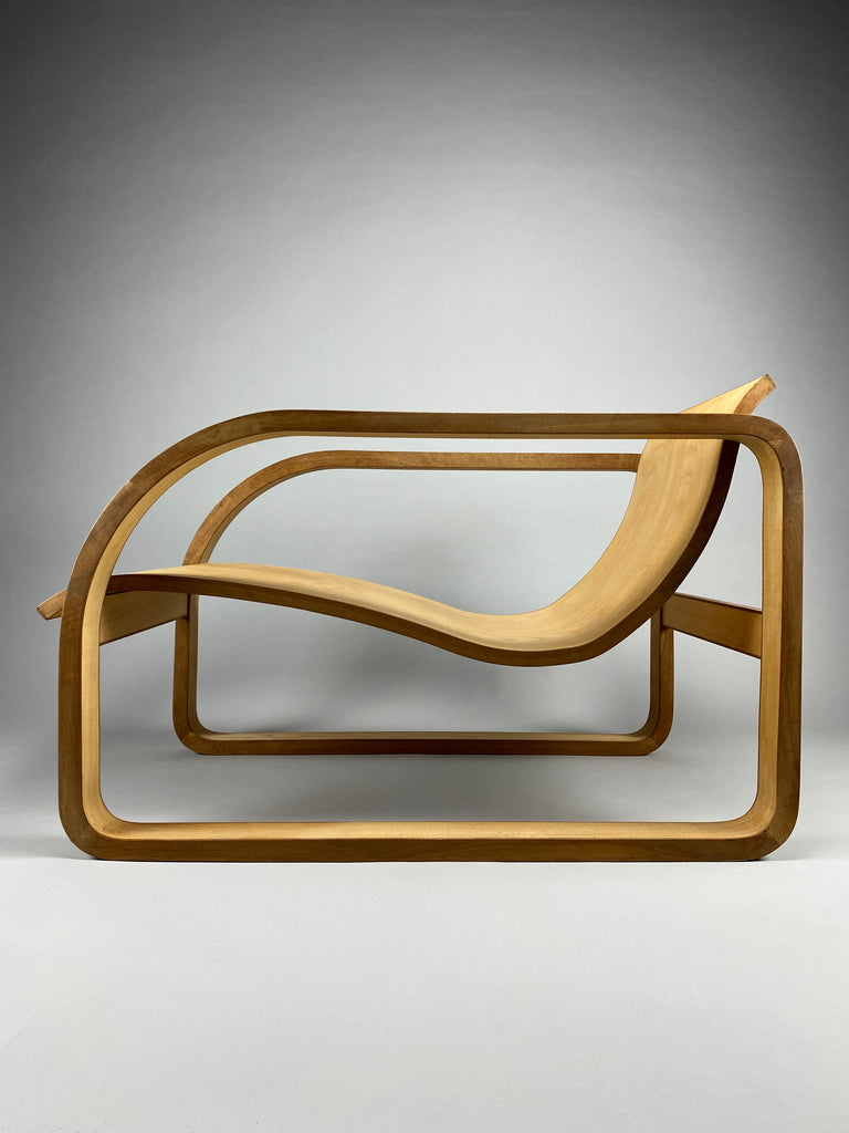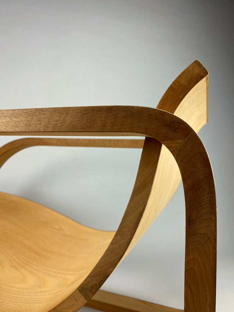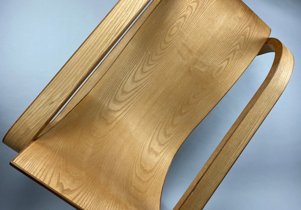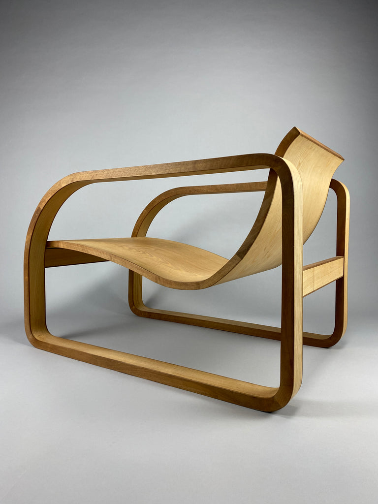 Designed to delight the senses, the lounge chair boasts mesmerizing curves that beckon you to sit and relax. Crafted from fine Maple veneer, the chair's graceful contours are accentuated by contrasting edges of rich Jatoba wood, creating a visual harmony that is simply breathtaking.