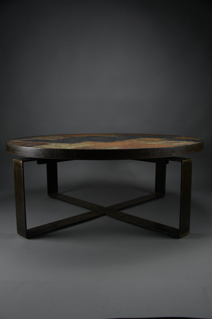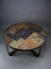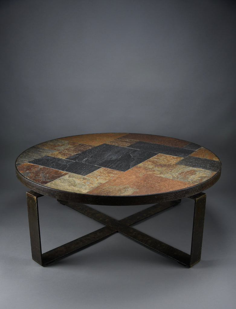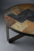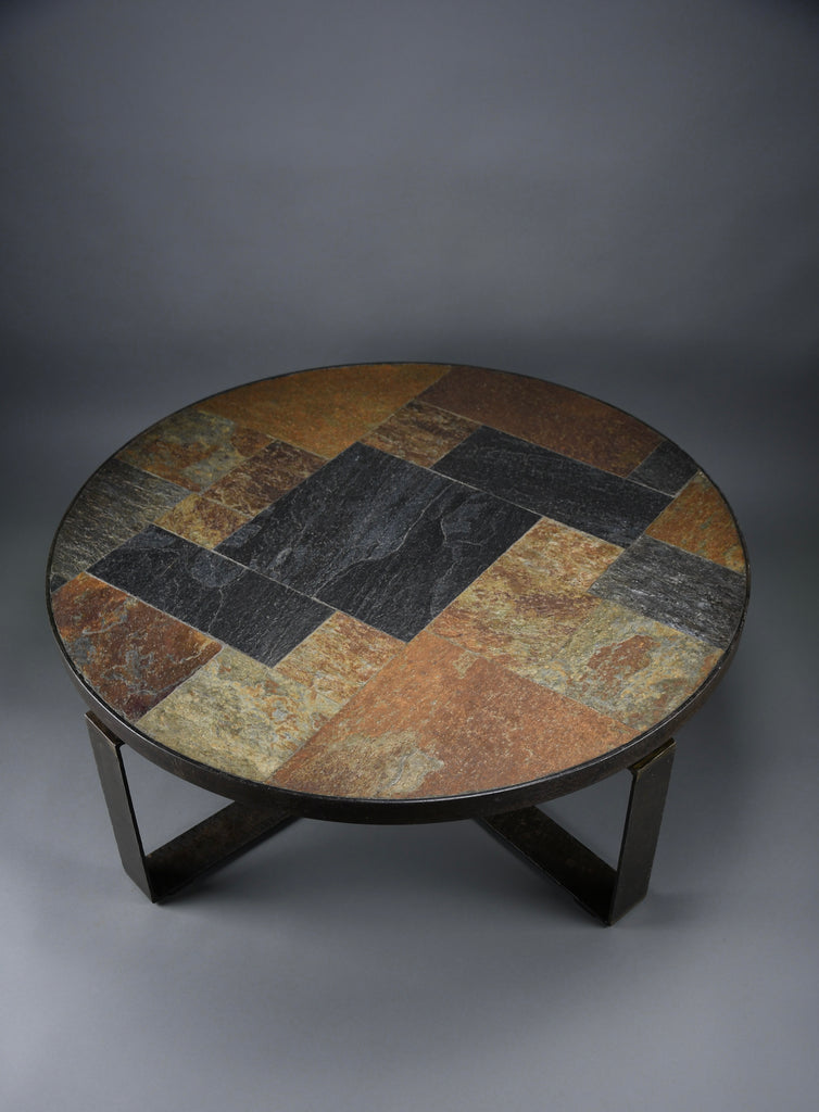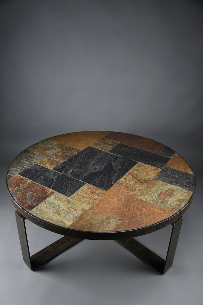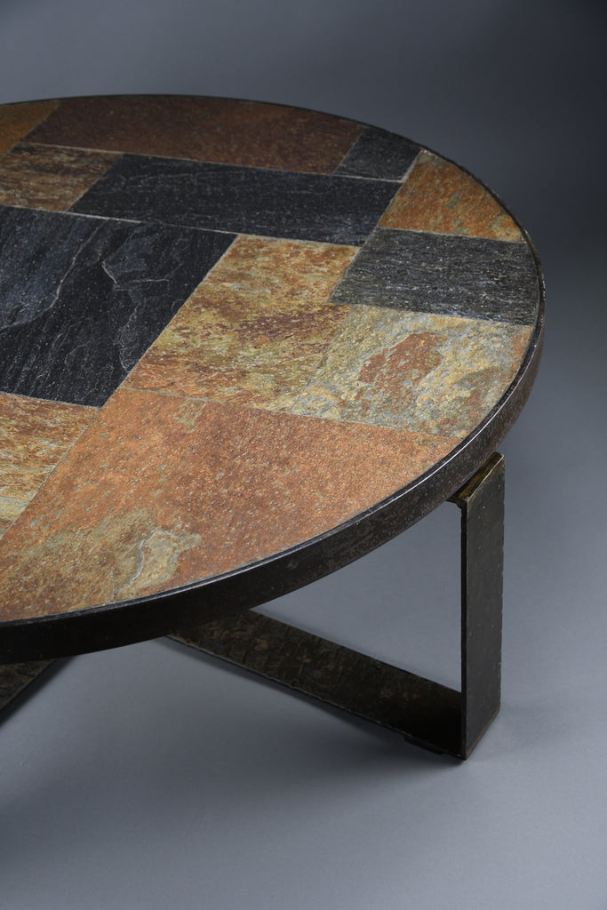 This sculptural brutalist round coffee table by Paul Kingma is a powerful example of the designer’s signature approach to material, texture, and form. Produced in the Netherlands during the 1970s, the table features a visually “floating” circular top composed of irregularly sized Norwegian slate fragments embedded in concrete, forming a richly textured, mosaic-like surface with strong natural variation.