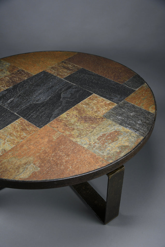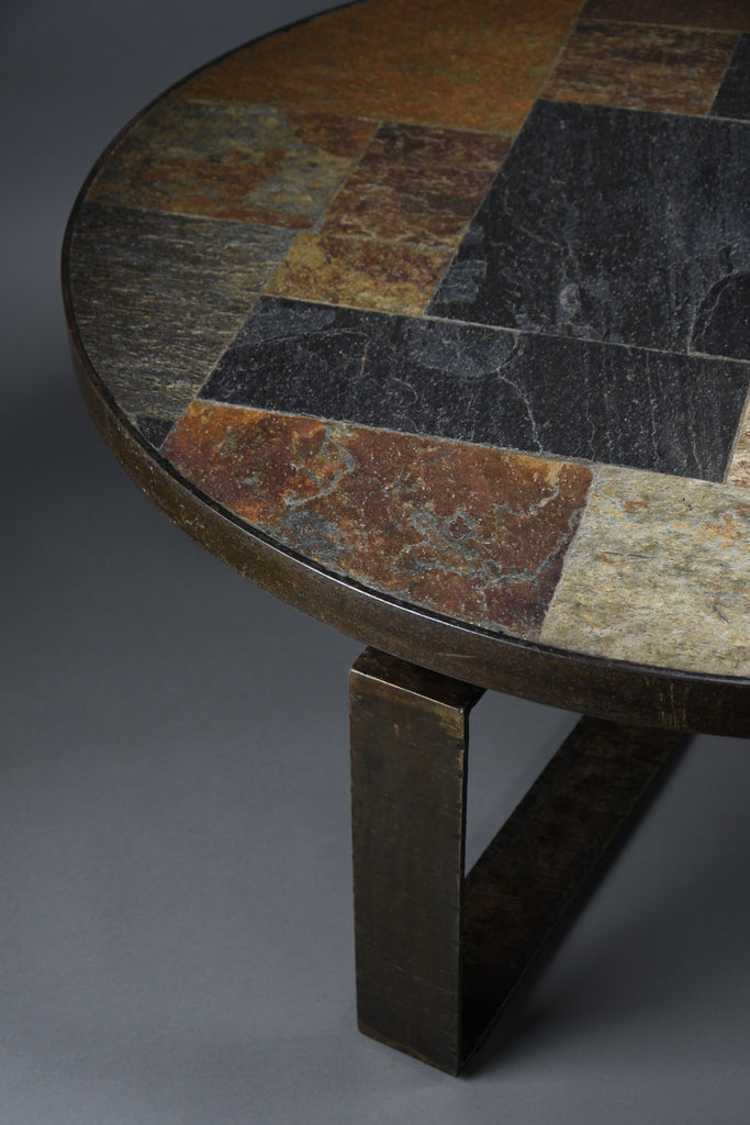 Paul Kingma Brutalist Round Coffee Table in Norwegian Slate, Concrete and Hammered Brass, Netherlands, 1970s