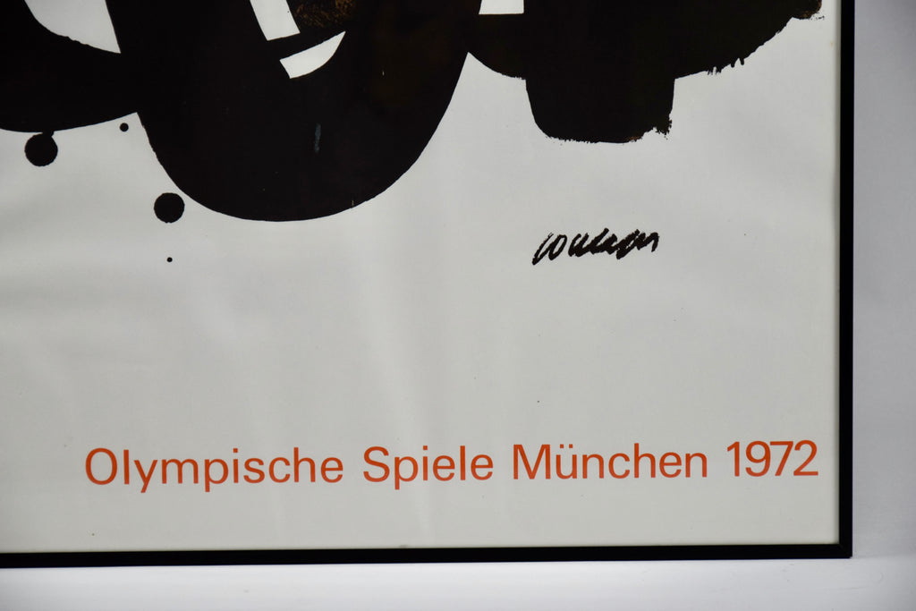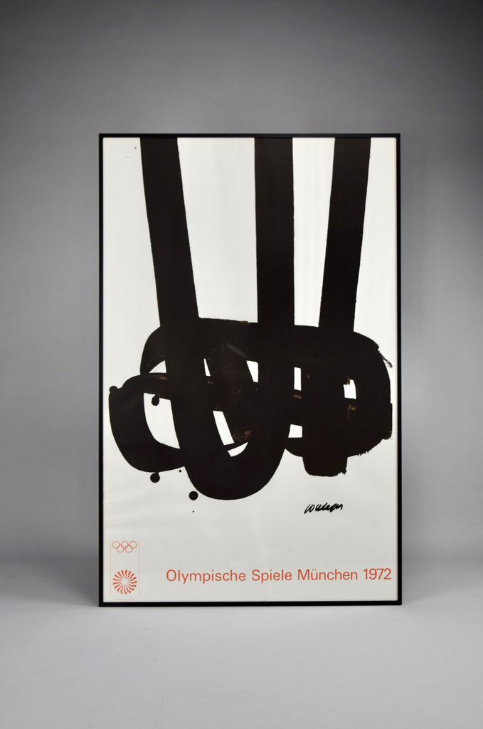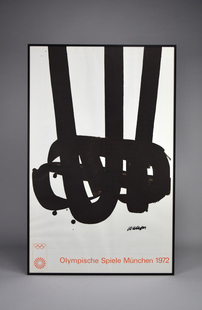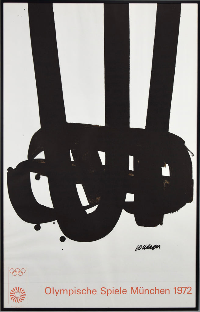 The 1972 München Olympic Poster reflects Soulages' signature style, with its striking use of black and abstract forms that evoke a sense of movement and energy. As an official poster for the Olympic Games, it not only captures the essence of athletic prowess but also represents the fusion of sports and art on a global stage.