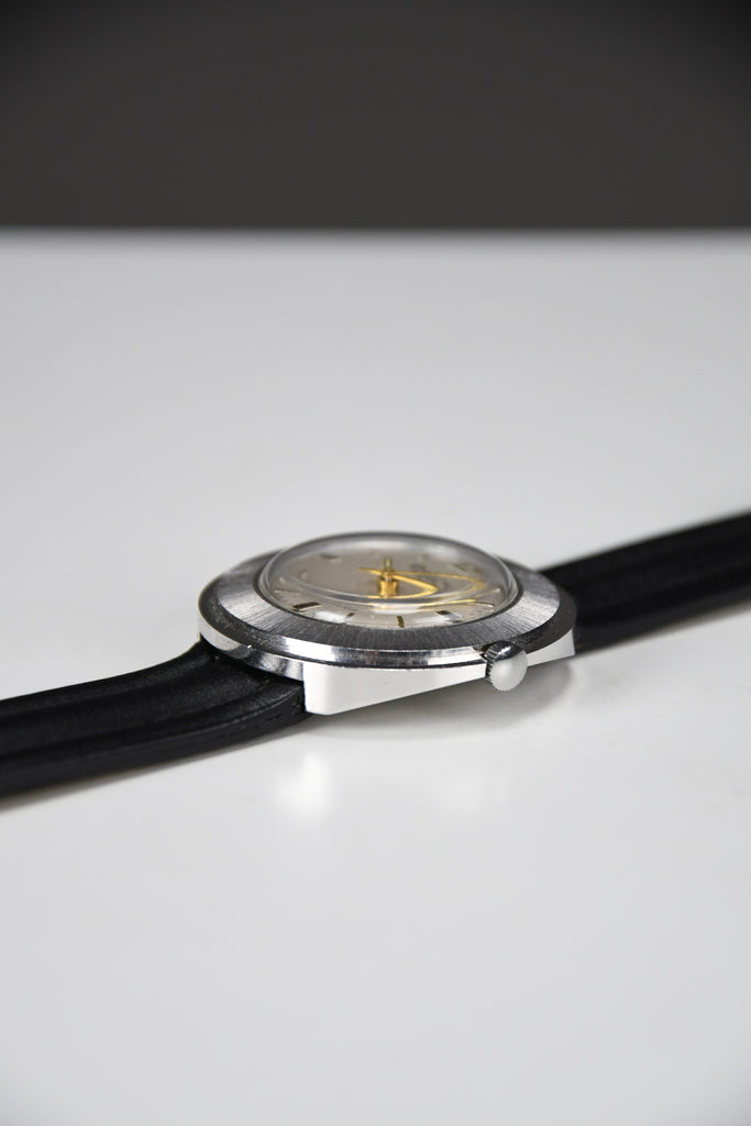 - Strap: Fitted with a new black leather strap to complement its vintage look