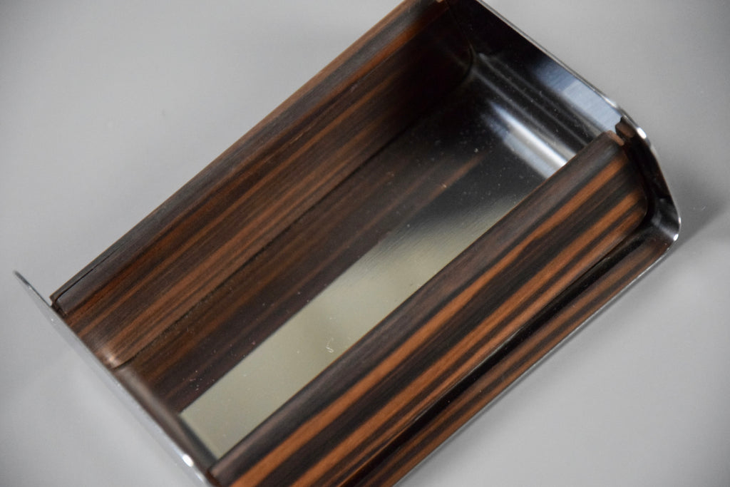 Discover a pristine example of Italian modernist design with this rare new old stock “Rodi” box, designed in 1960 by Enzo Mari for Danese Milano. Crafted from brushed stainless steel and warm, richly grained Jatoba wood, this compact yet striking object embodies Mari’s minimalist philosophy and deep commitment to functional beauty.