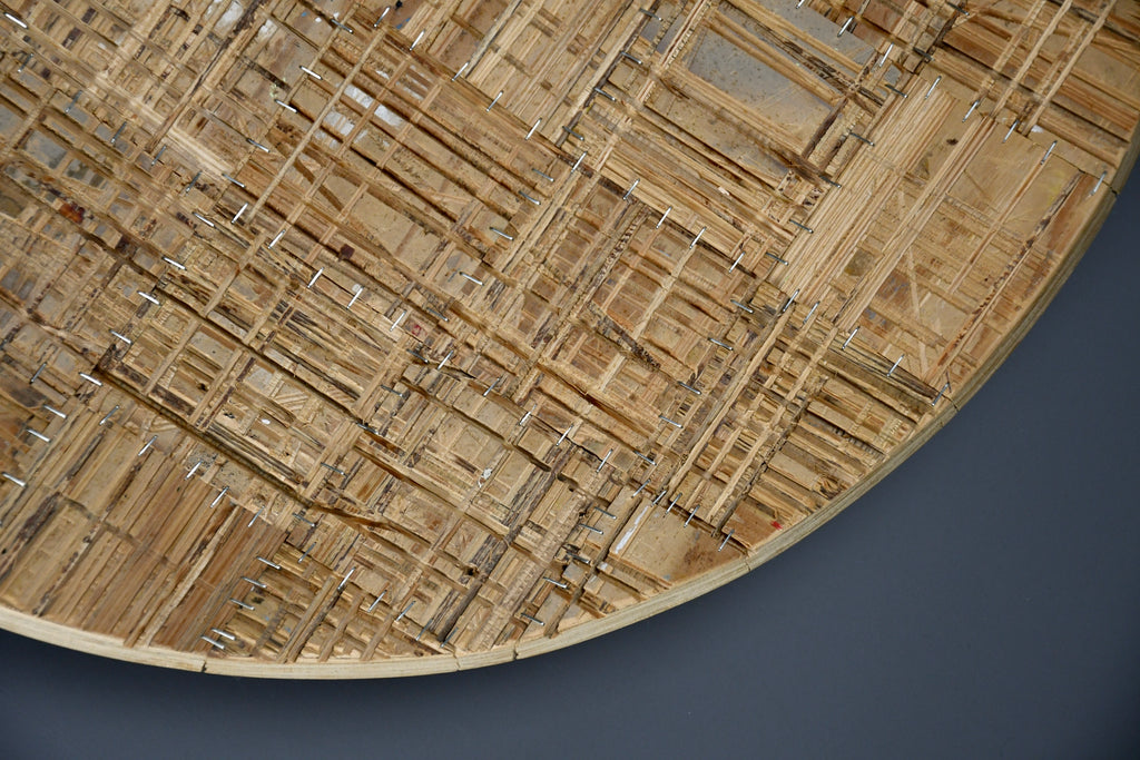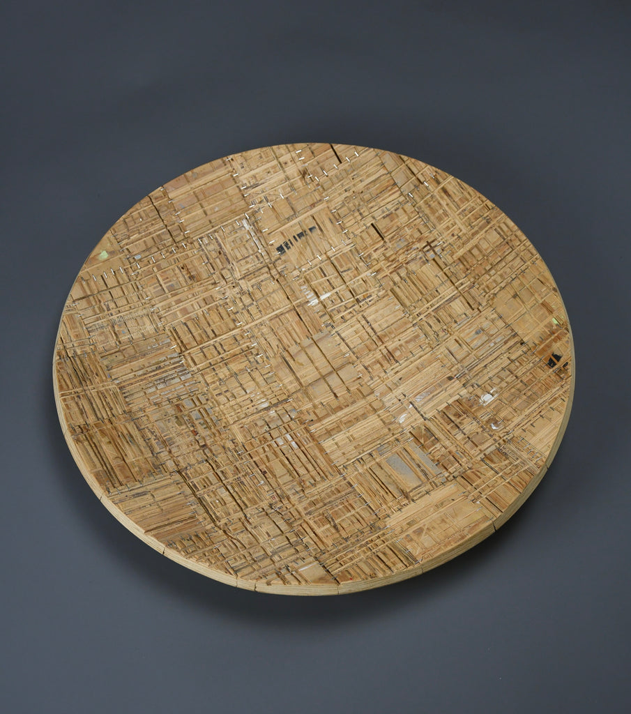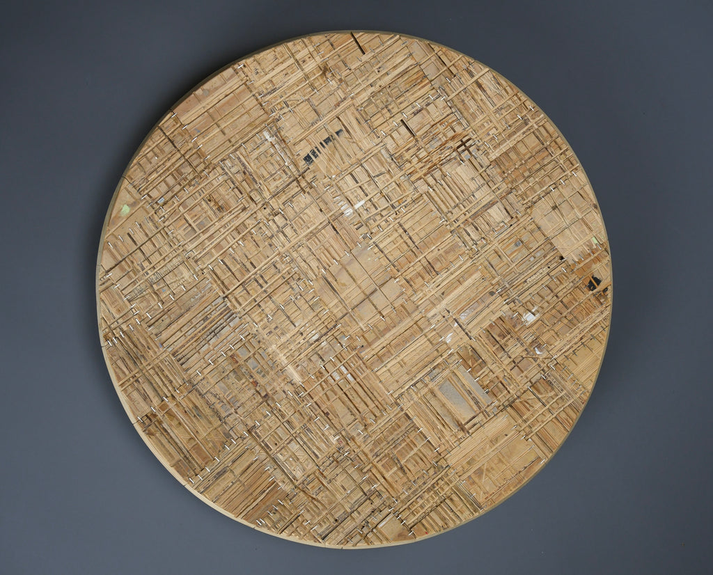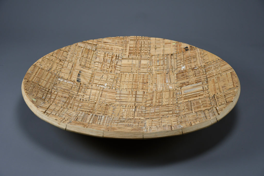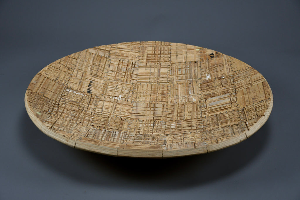 A striking and unique handcrafted wooden bowl by Dutch artist Rik Davids, created in 2001. Measuring an impressive 55 cm (21.65 inches) in diameter, this sculptural piece is composed entirely of reclaimed wood, meticulously assembled and artistically detailed. The surface features an expressive patchwork of wooden segments, joined with industrial-style metal staples, showcasing visible wear, grain variation, and traces of original use—including subtle remnants of paint and printed text.