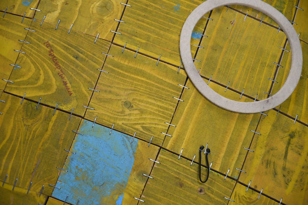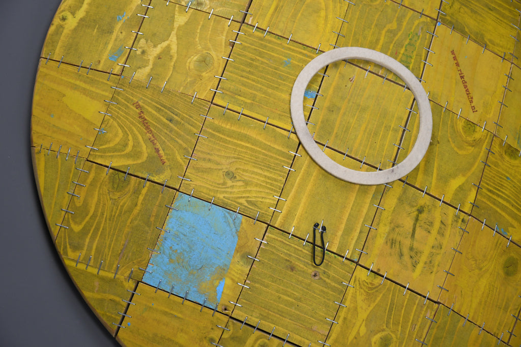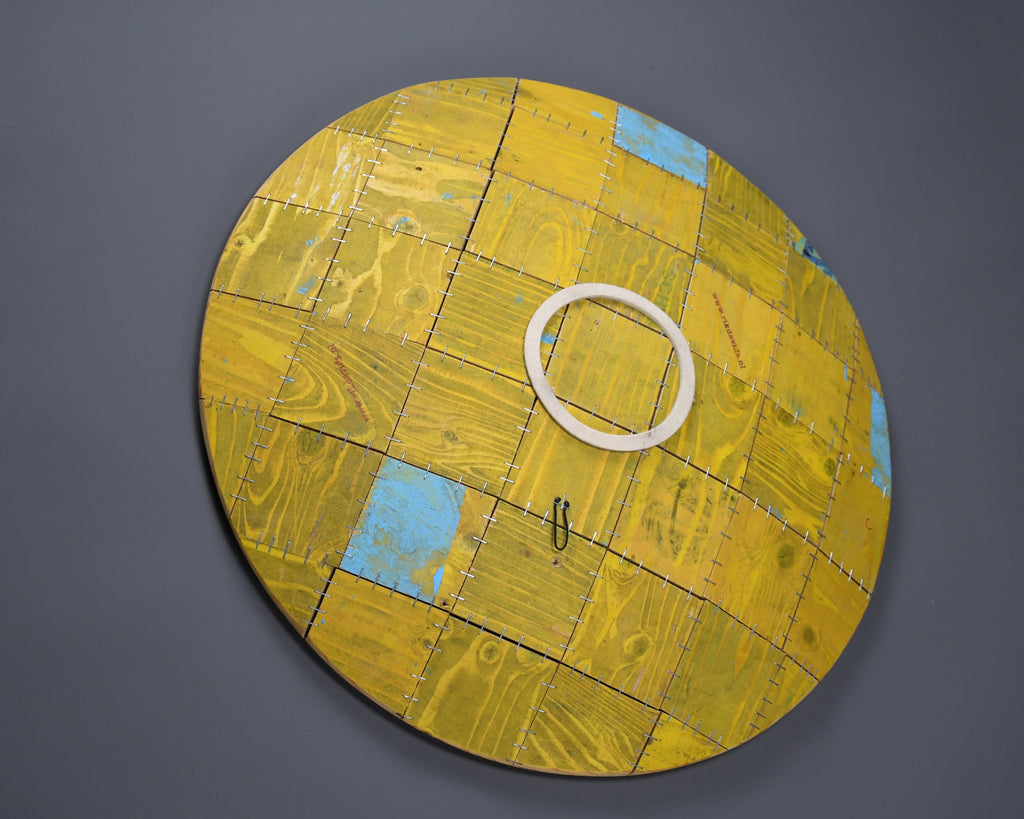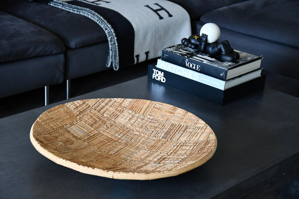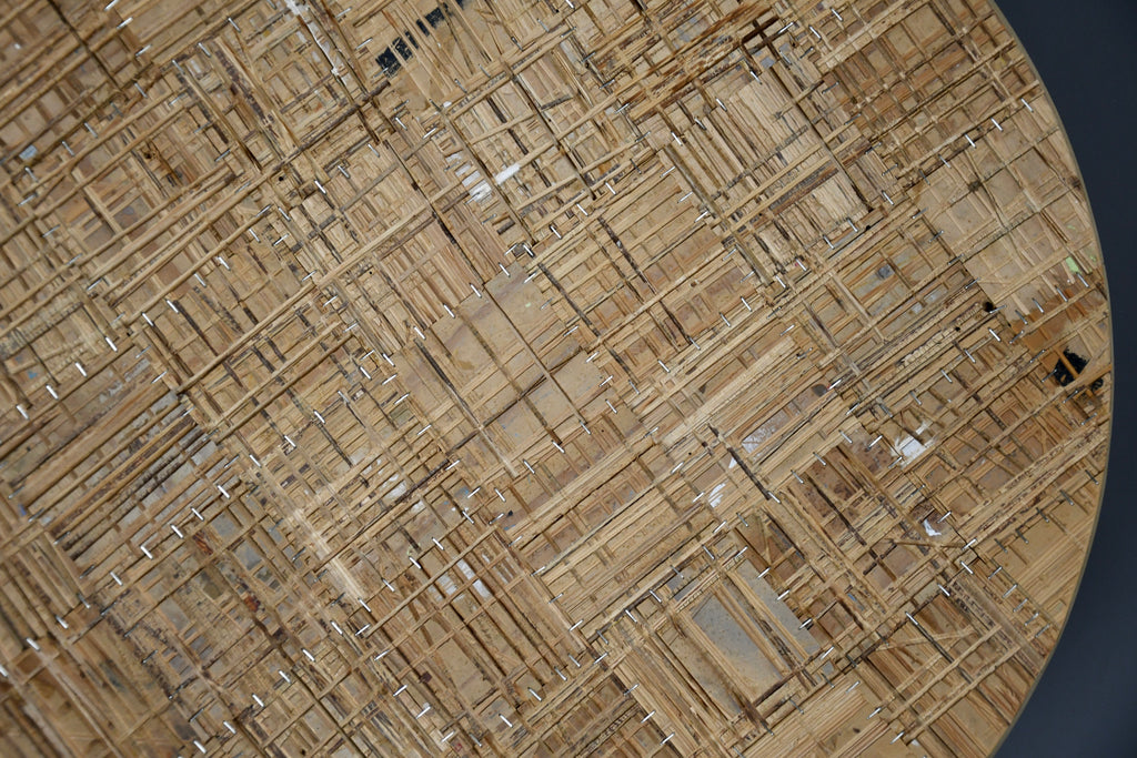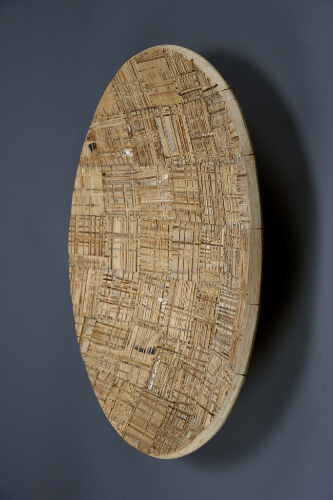 A striking and unique handcrafted wooden bowl by Dutch artist Rik Davids, created in 2001. Measuring an impressive 55 cm (21.65 inches) in diameter, this sculptural piece is composed entirely of reclaimed wood, meticulously assembled and artistically detailed. The surface features an expressive patchwork of wooden segments, joined with industrial-style metal staples, showcasing visible wear, grain variation, and traces of original use—including subtle remnants of paint and printed text.