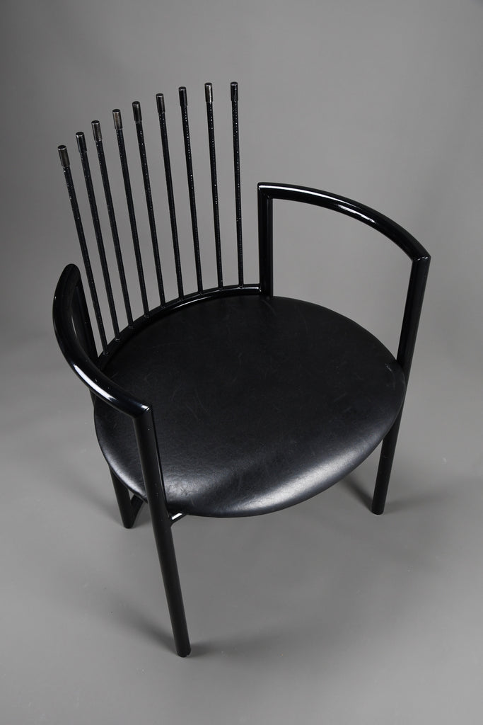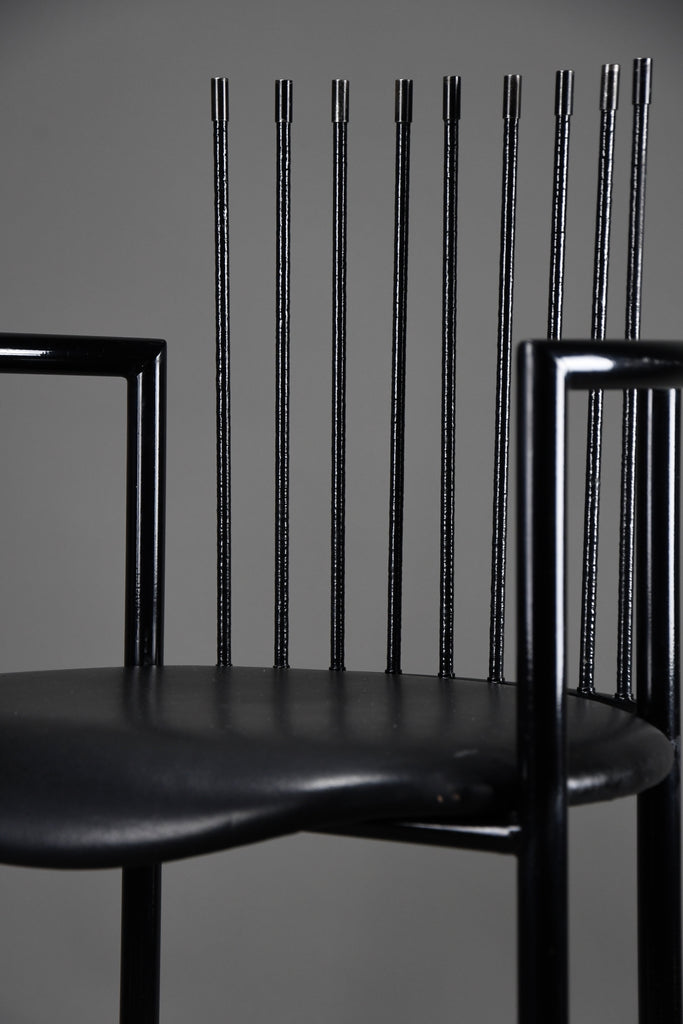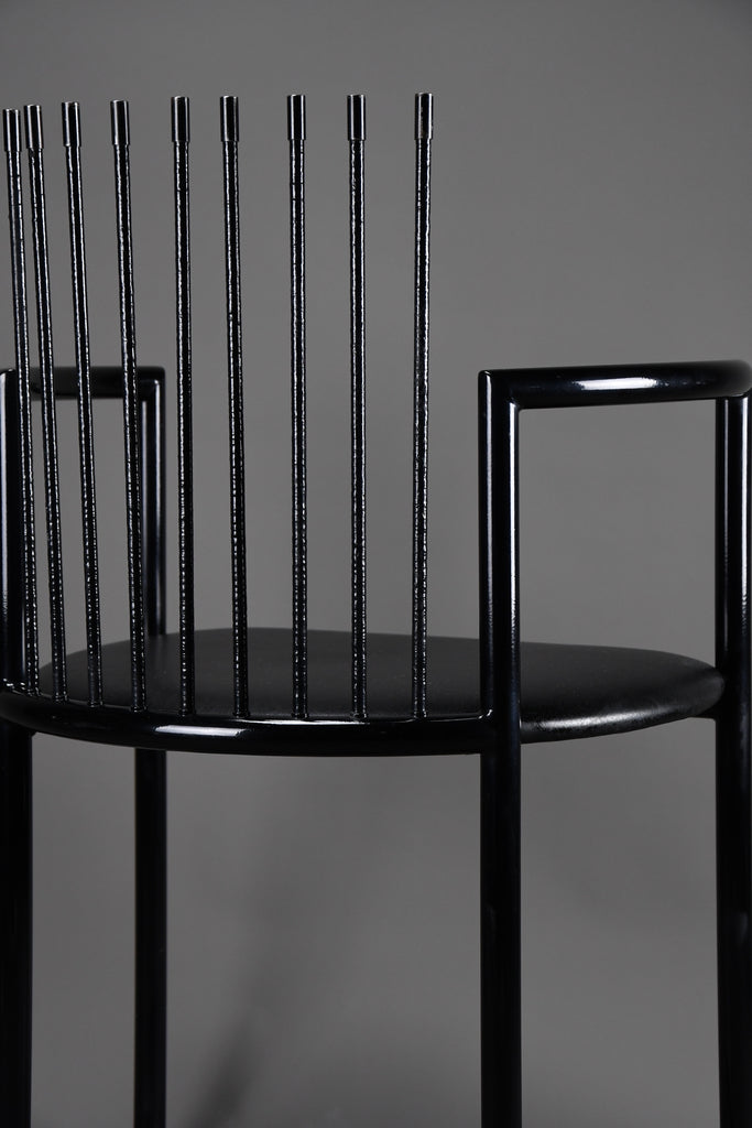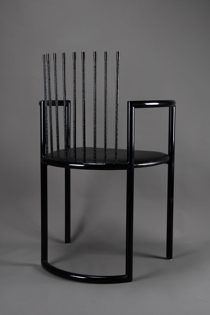 Step into the world of avant-garde design with this rare and striking postmodern armchair. A true conversation piece, this chair seamlessly blends sculptural elegance with functional comfort. Its sleek black lacquered metal frame and distinctive flexible rod backrest evoke the radical aesthetics of the 1980s and early 1990s, reminiscent of the visionary works of Shiro Kuramata, Michele De Lucchi, and the Memphis Group.
