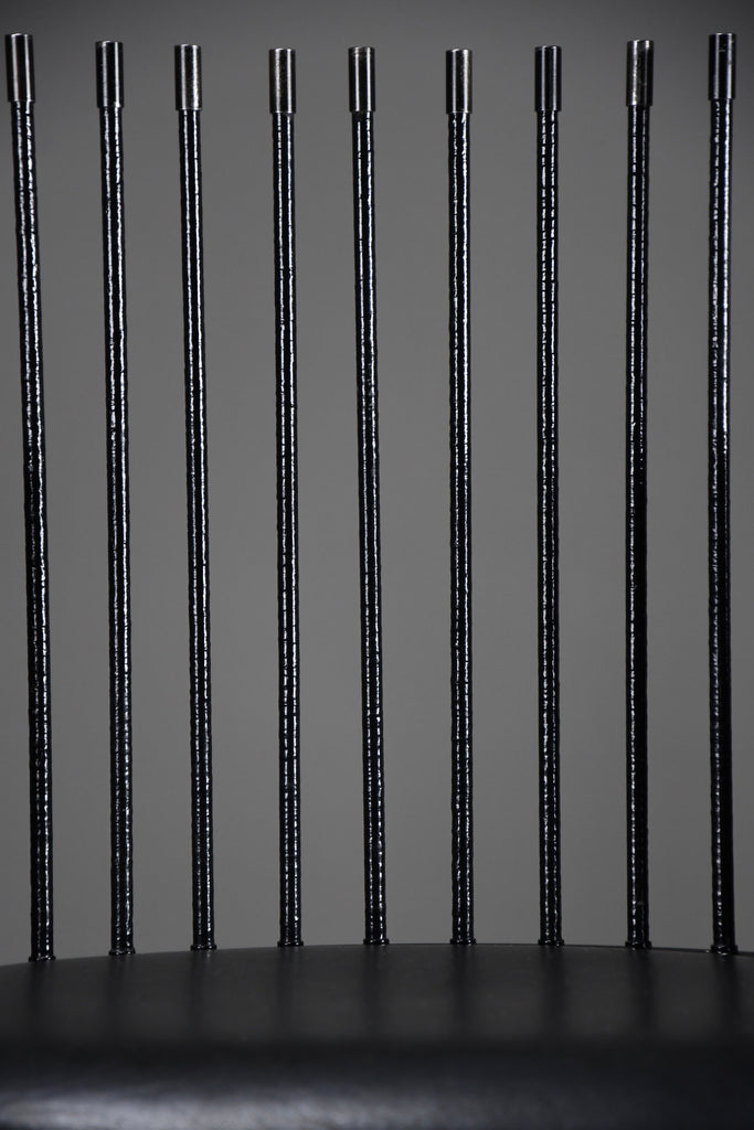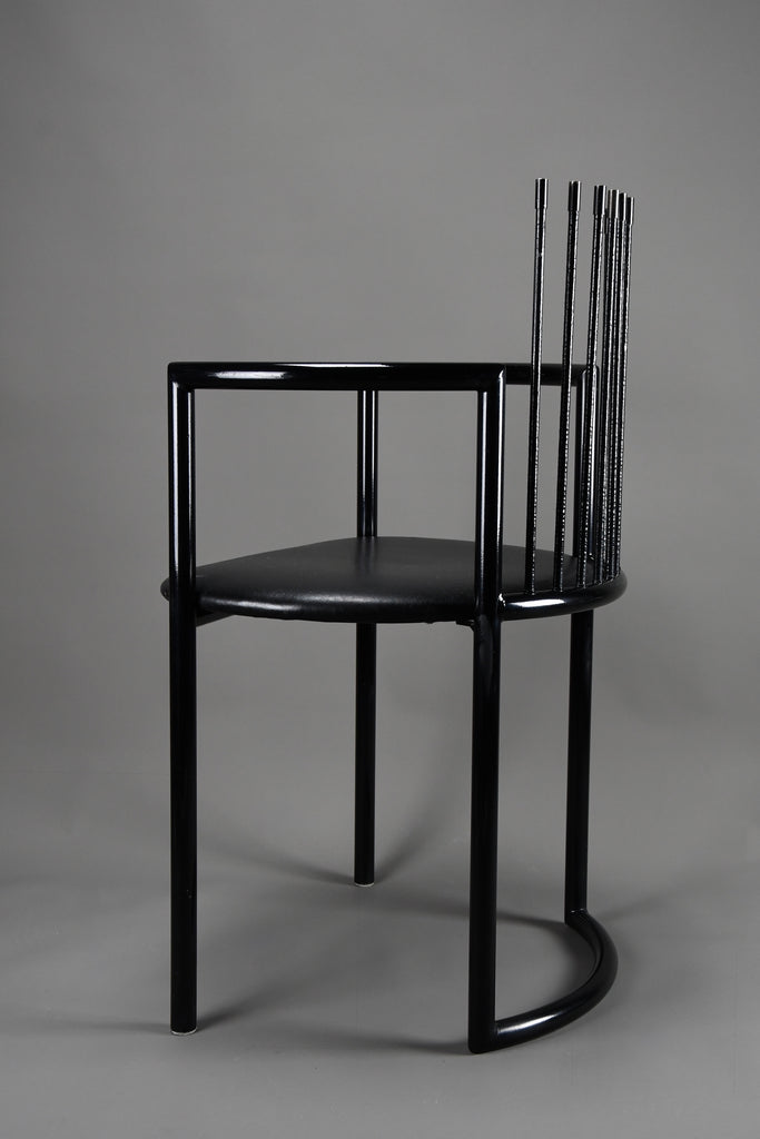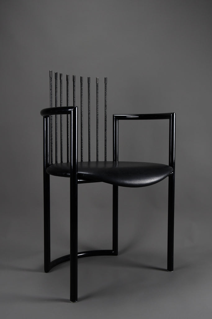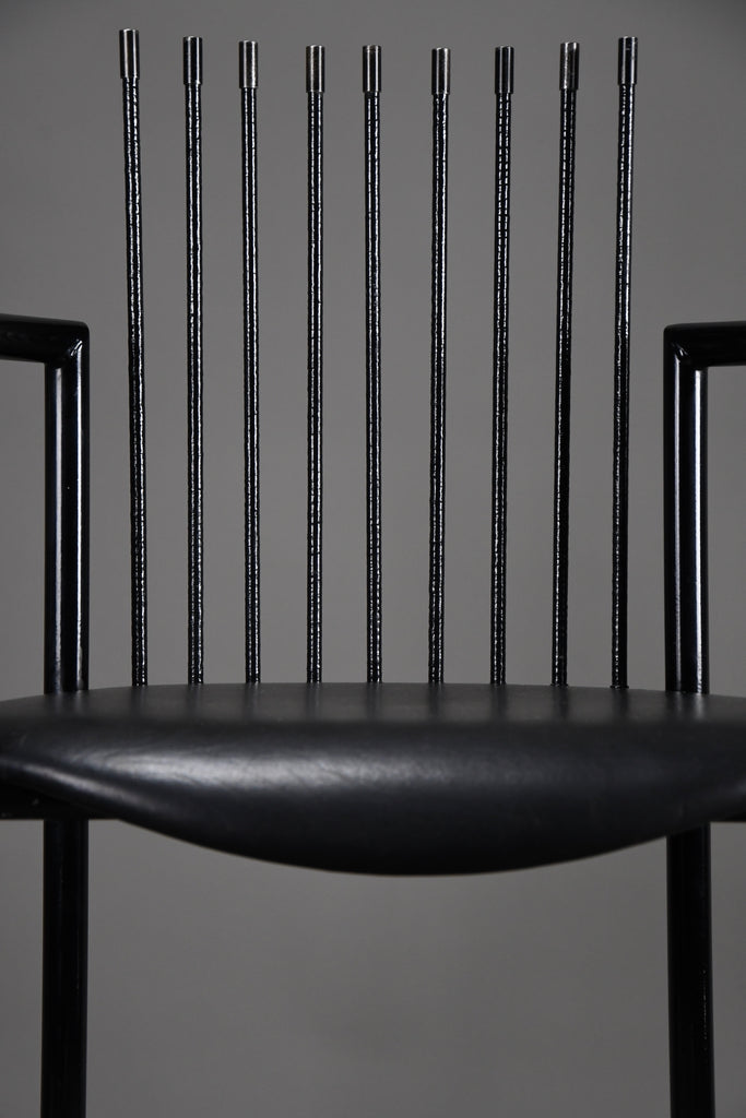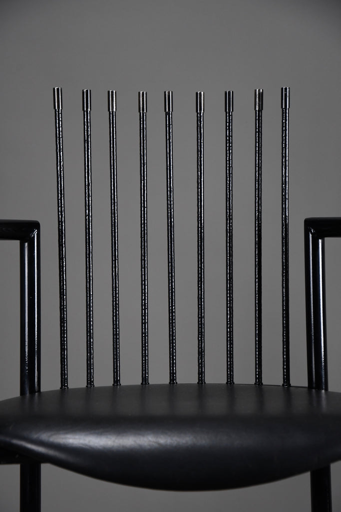 Step into the world of avant-garde design with this rare and striking postmodern armchair. A true conversation piece, this chair seamlessly blends sculptural elegance with functional comfort. Its sleek black lacquered metal frame and distinctive flexible rod backrest evoke the radical aesthetics of the 1980s and early 1990s, reminiscent of the visionary works of Shiro Kuramata, Michele De Lucchi, and the Memphis Group.