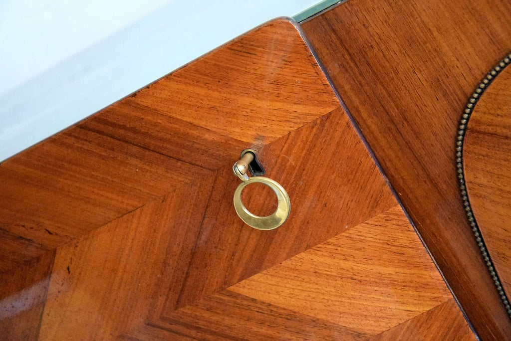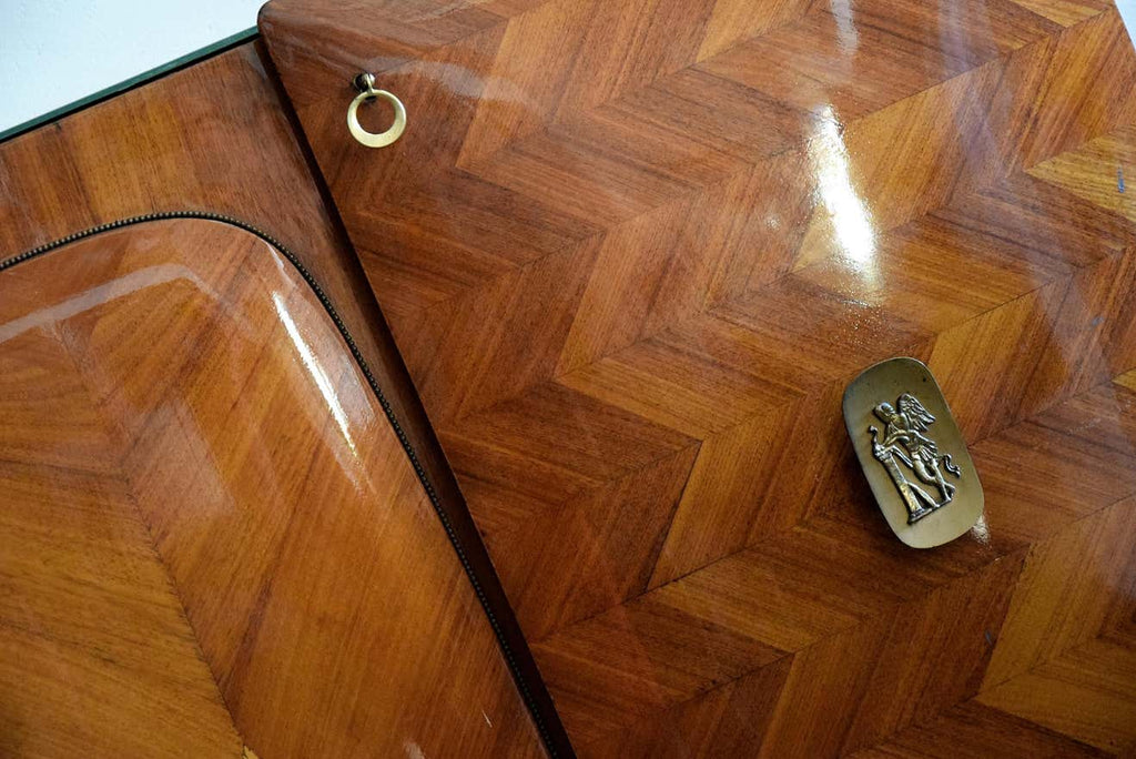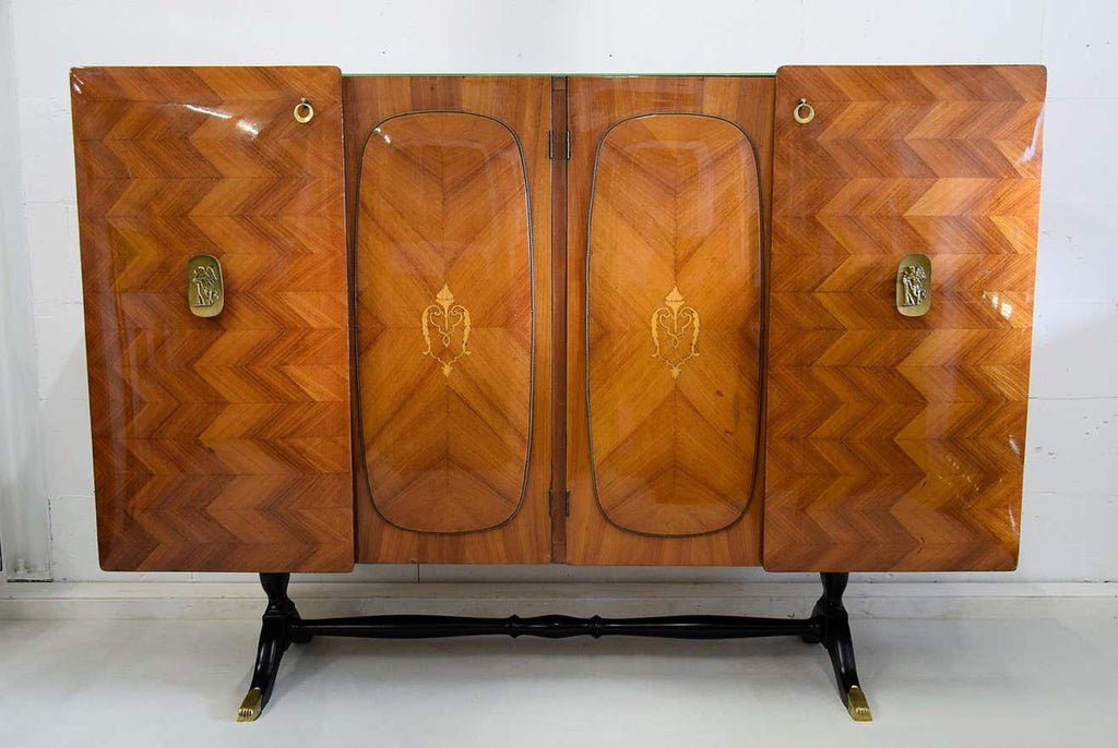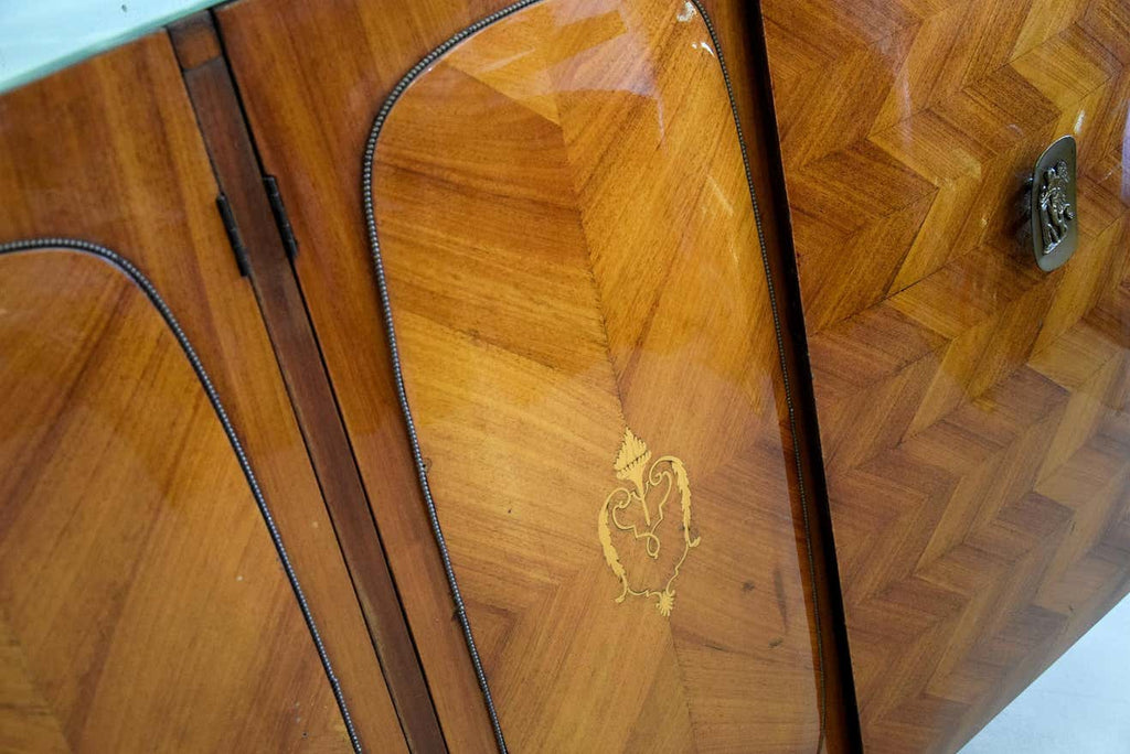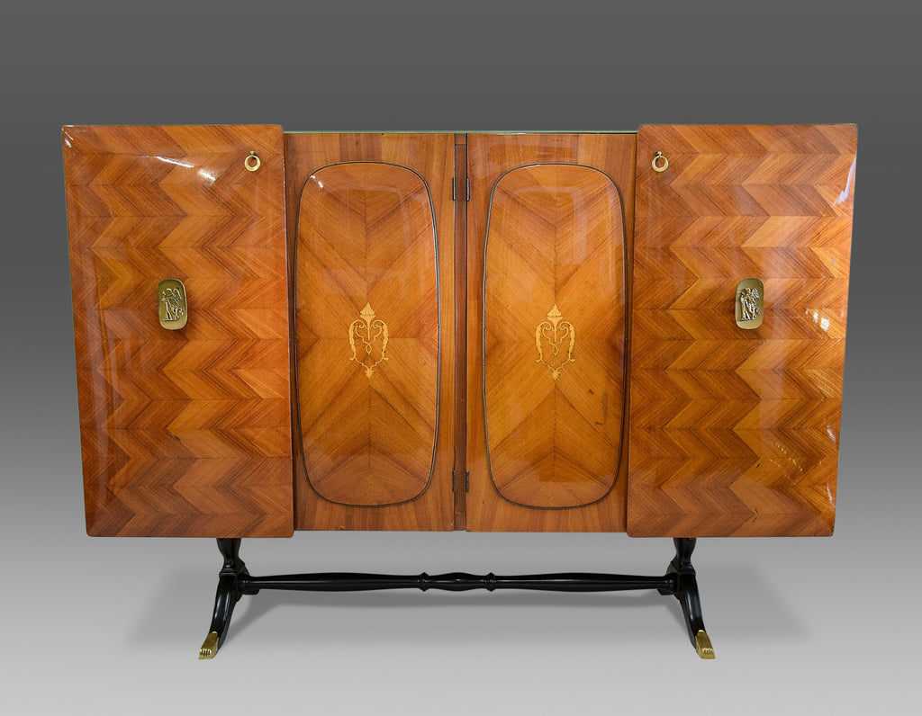 Step back into the glamour of mid-century Italian design with this exquisite 1950’s 4-door credenza by the renowned Vittorio Dassi. This stunning piece is a testament to Dassi's mastery in combining functionality with unparalleled elegance. The credenza features a beautifully patterned veneer, showcasing an intricate chevron design that adds depth and texture to any space. The doors are adorned with delicate inlays and elegant brass handles, enhancing its luxurious appeal.