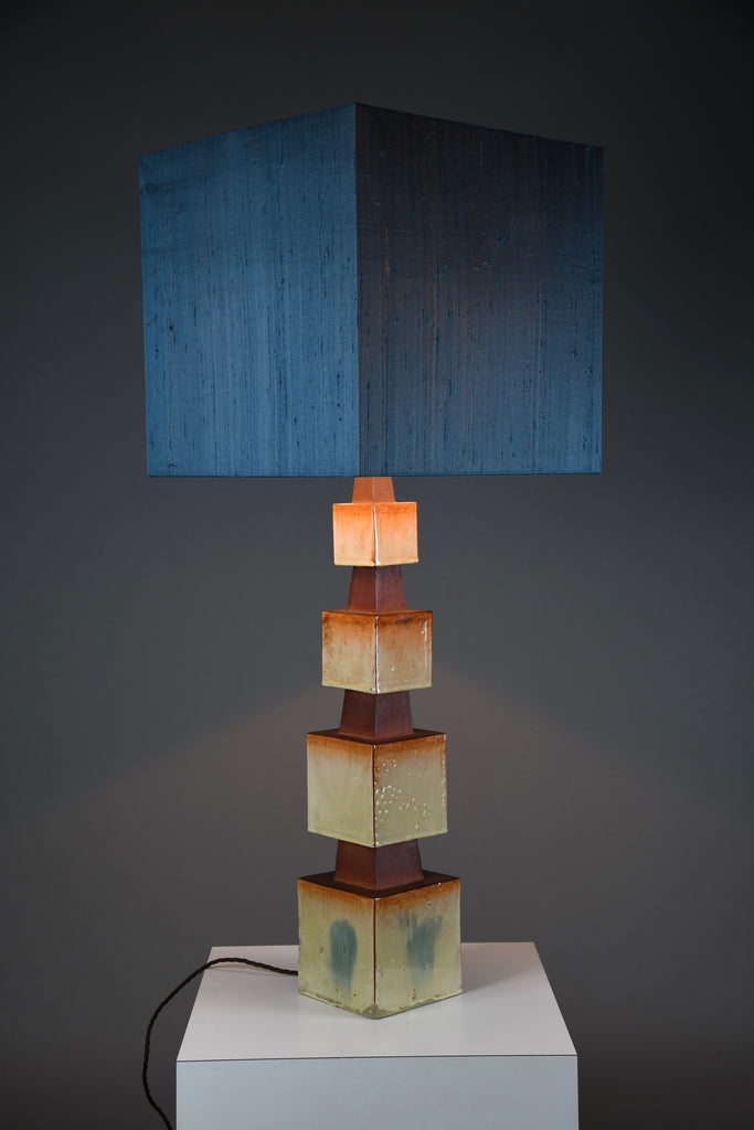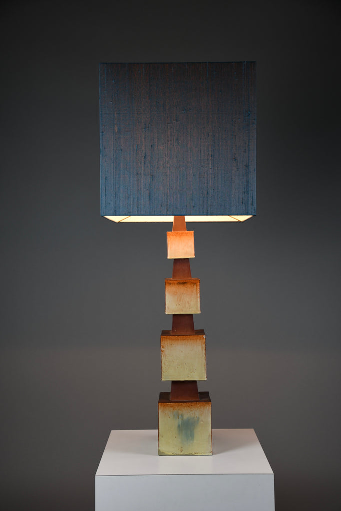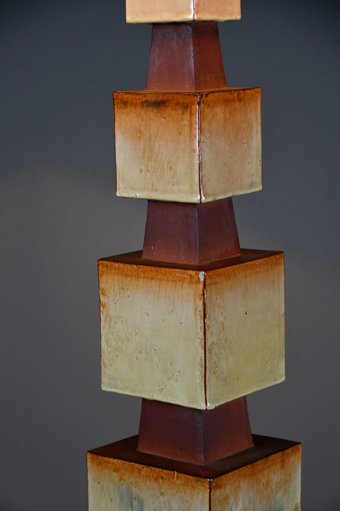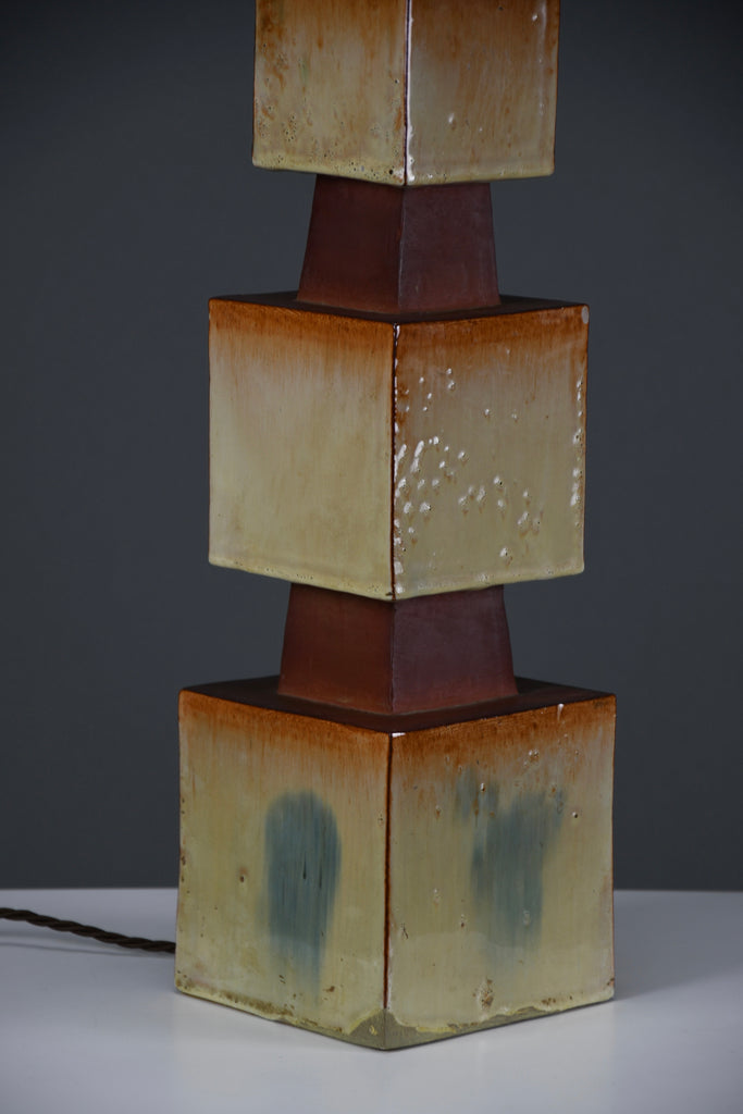 Striking and architectural, this handcrafted ceramic table lamp from the 1960s showcases bold mid-century modern form with a distinct sculptural presence. Composed of stacked geometric blocks in subtly tapering proportions, the base features layered ceramic cubes glazed in earthy tones ranging from ochre and rust to celadon green. The textured surface and organic firing effects evoke the expressive quality of studio pottery from the period.