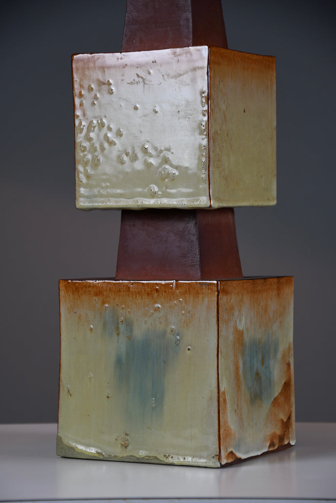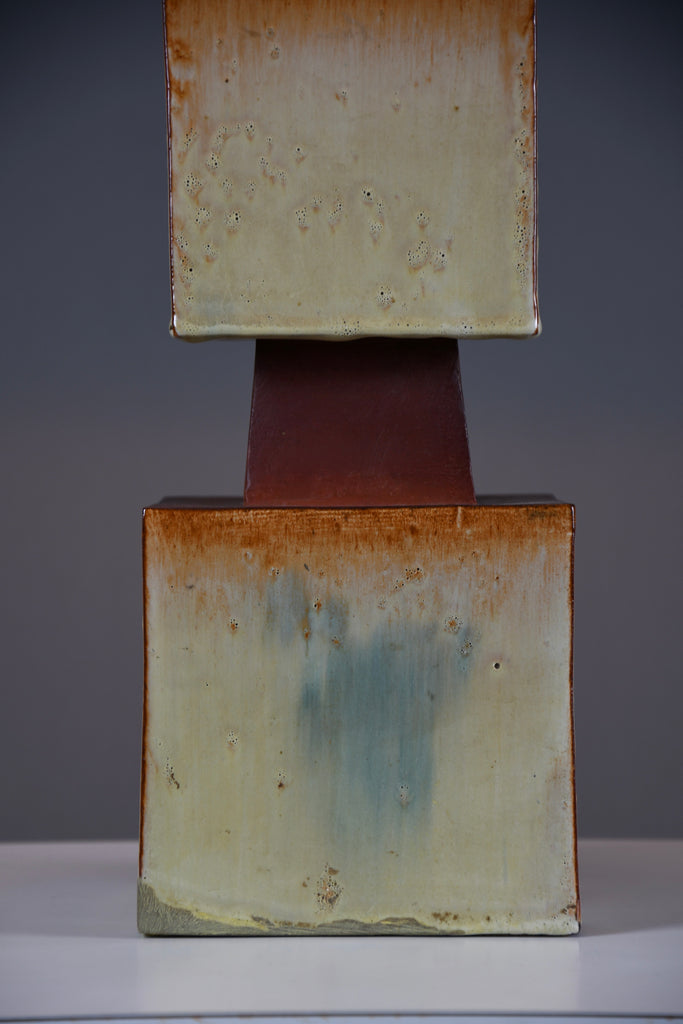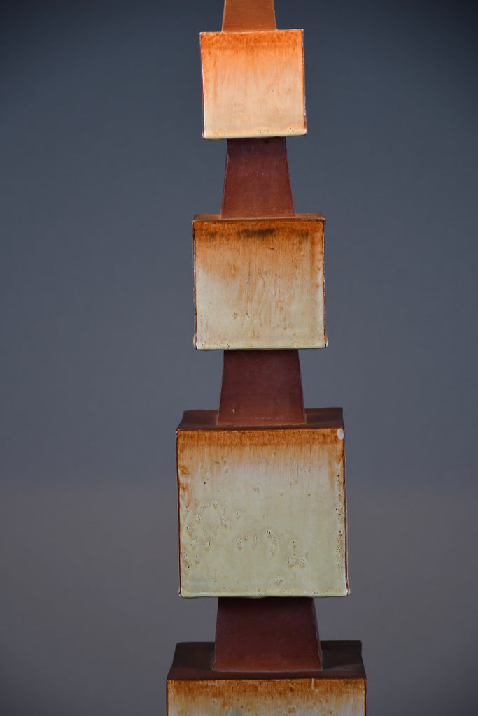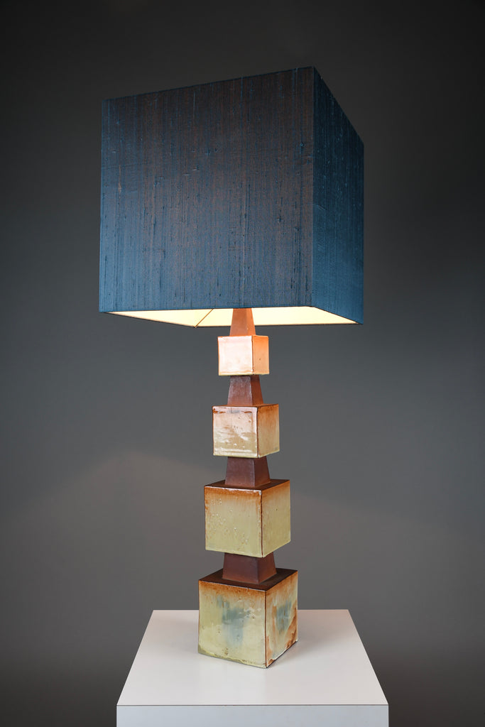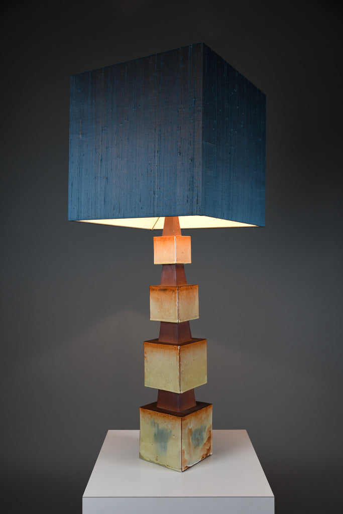 Striking and architectural, this handcrafted ceramic table lamp from the 1960s showcases bold mid-century modern form with a distinct sculptural presence. Composed of stacked geometric blocks in subtly tapering proportions, the base features layered ceramic cubes glazed in earthy tones ranging from ochre and rust to celadon green. The textured surface and organic firing effects evoke the expressive quality of studio pottery from the period.