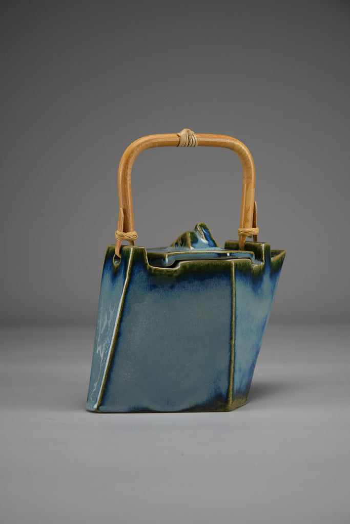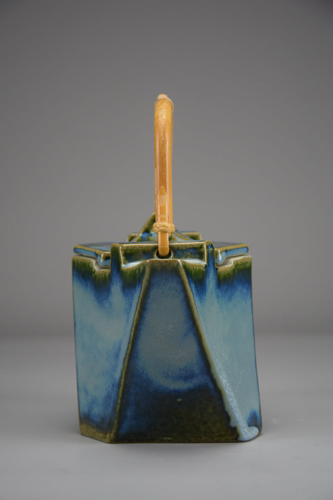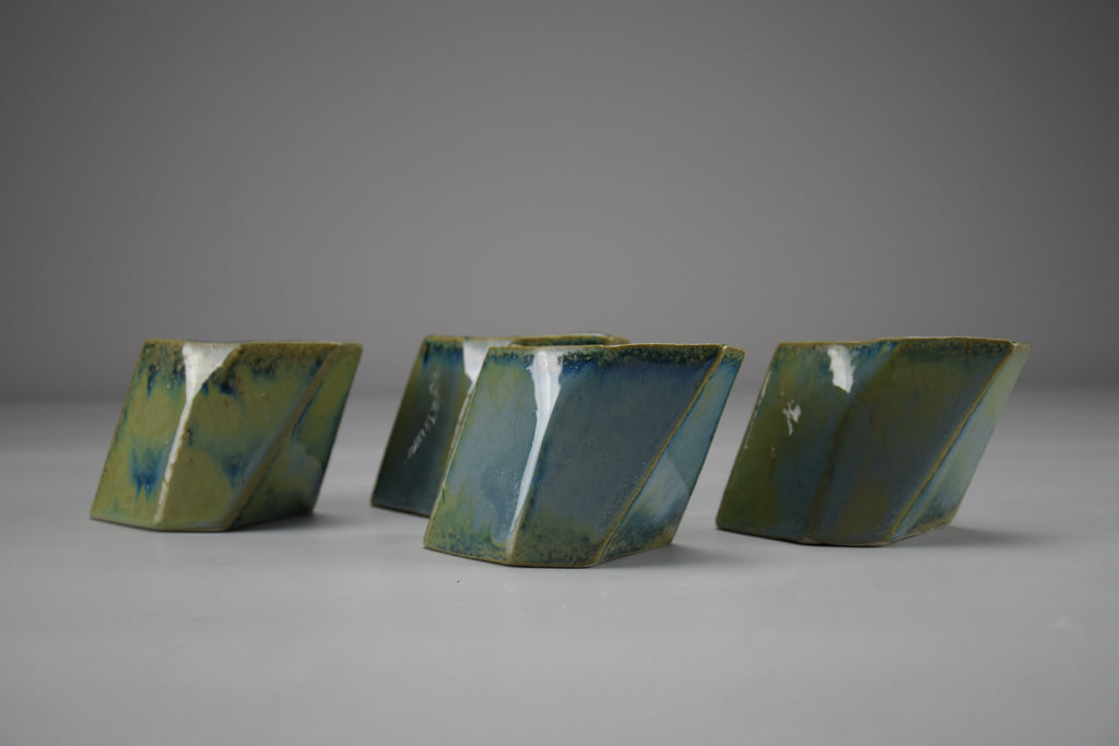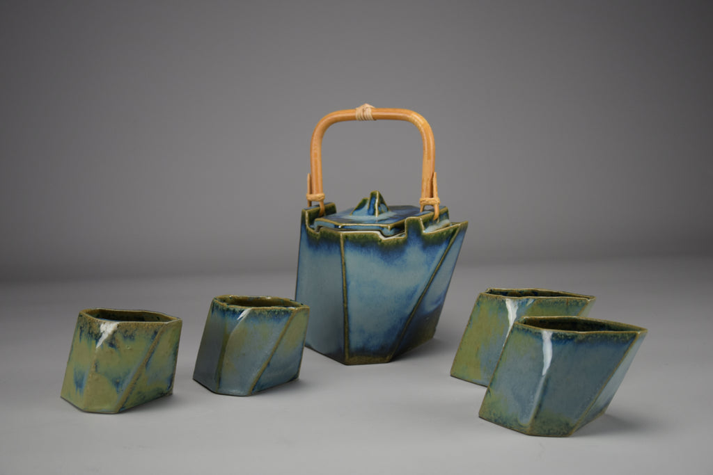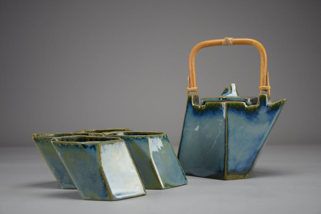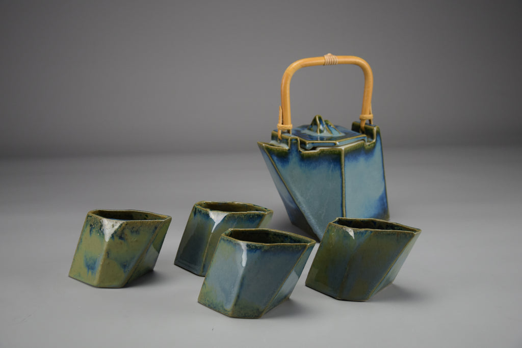 This tea set, signed by the enigmatic artist CHRL, is a testament to superior craftsmanship. The striking geometric forms and the rich, layered glazes create a visual spectacle that transforms any tea time into an extraordinary experience. The harmonious blend of blues and greens evokes the tranquility of nature, making each use a serene ritual.