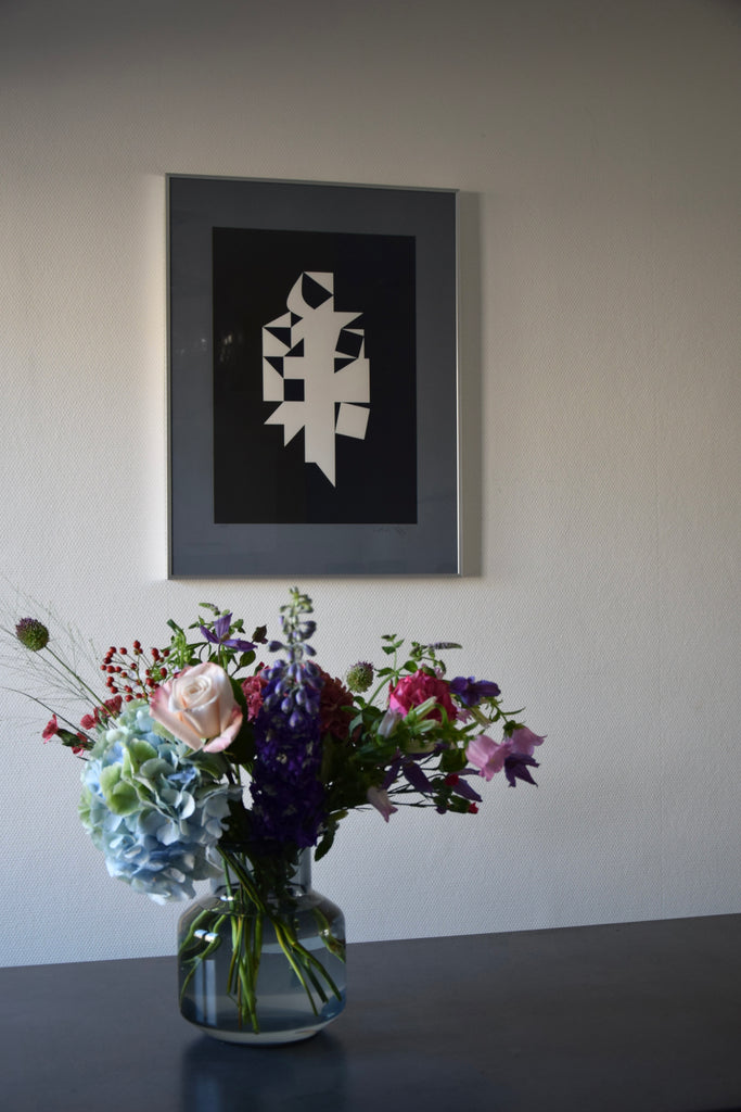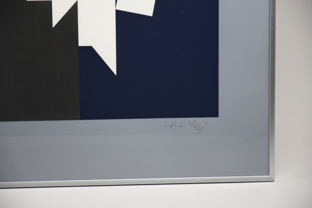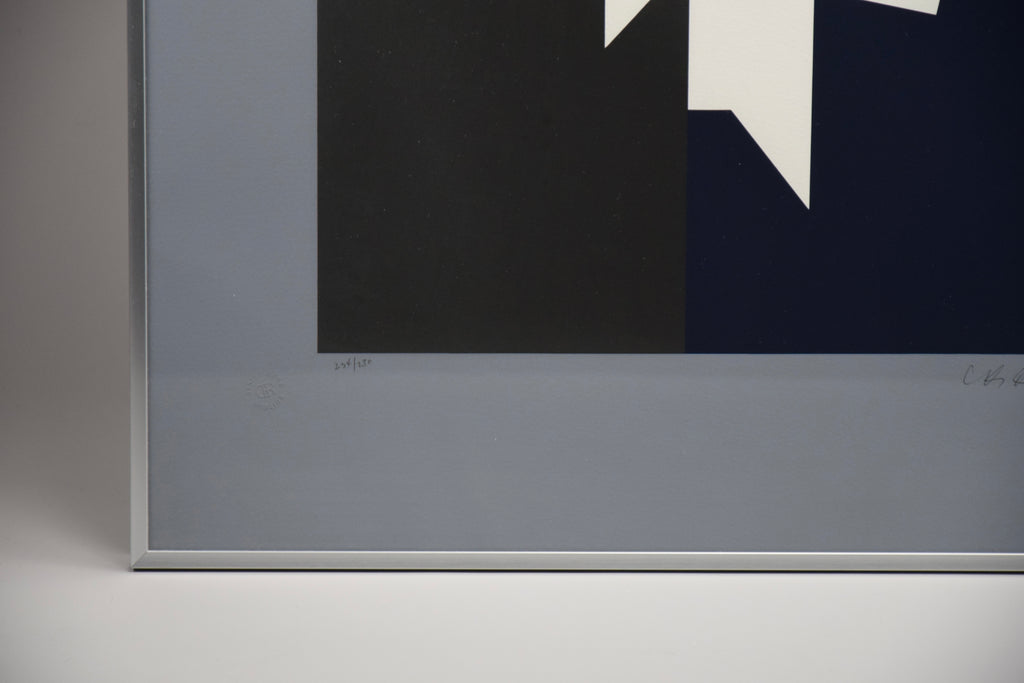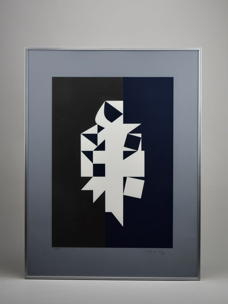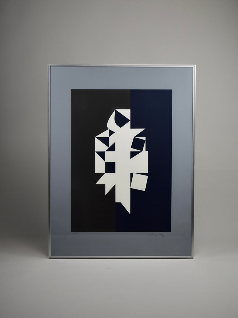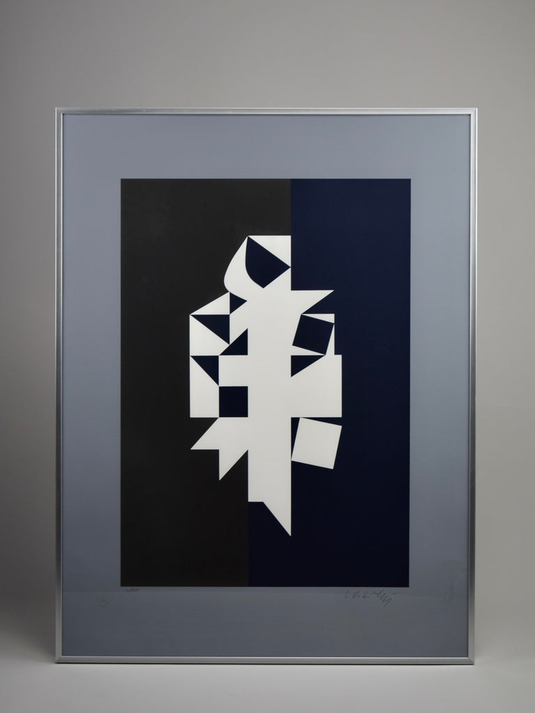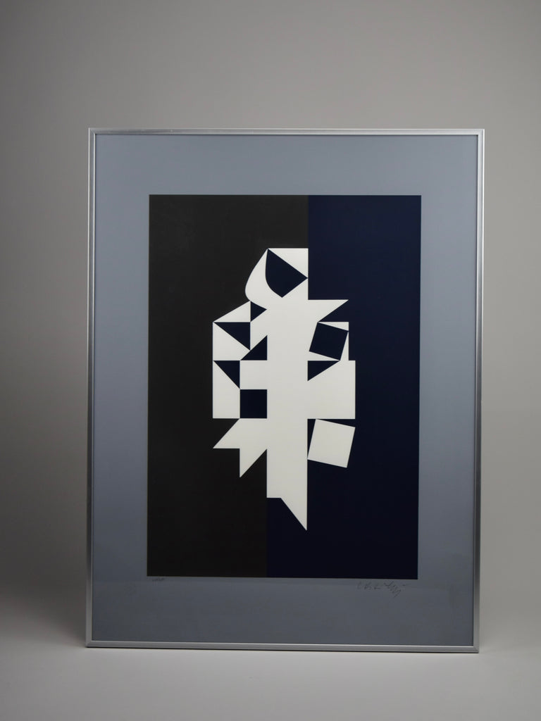 Presenting an exquisite 1975, limited edition piece by Victor Vasarely, the master of Op Art (Optical Art), numbered 234 out of 250. This signed work showcases Vasarely’s iconic geometric abstraction, blending sharp contrasts of black, white, and deep blue to create the illusion of dimensionality. His revolutionary approach to art, rooted in mathematics and geometry, continues to influence contemporary art and design, making this piece a valuable addition to any serious collection.