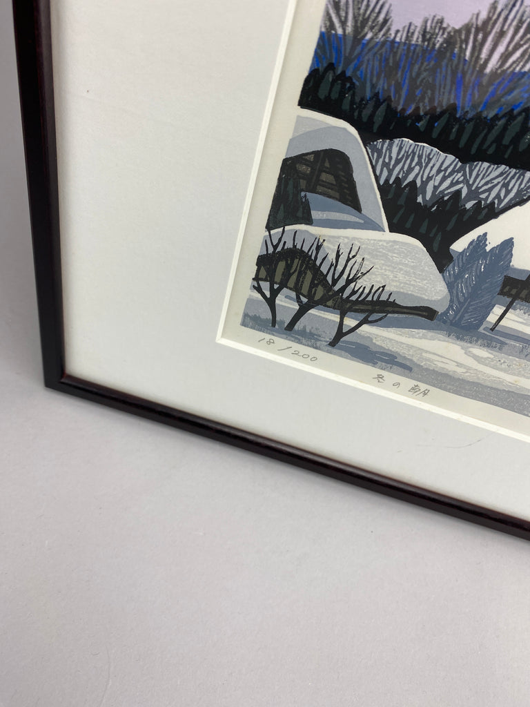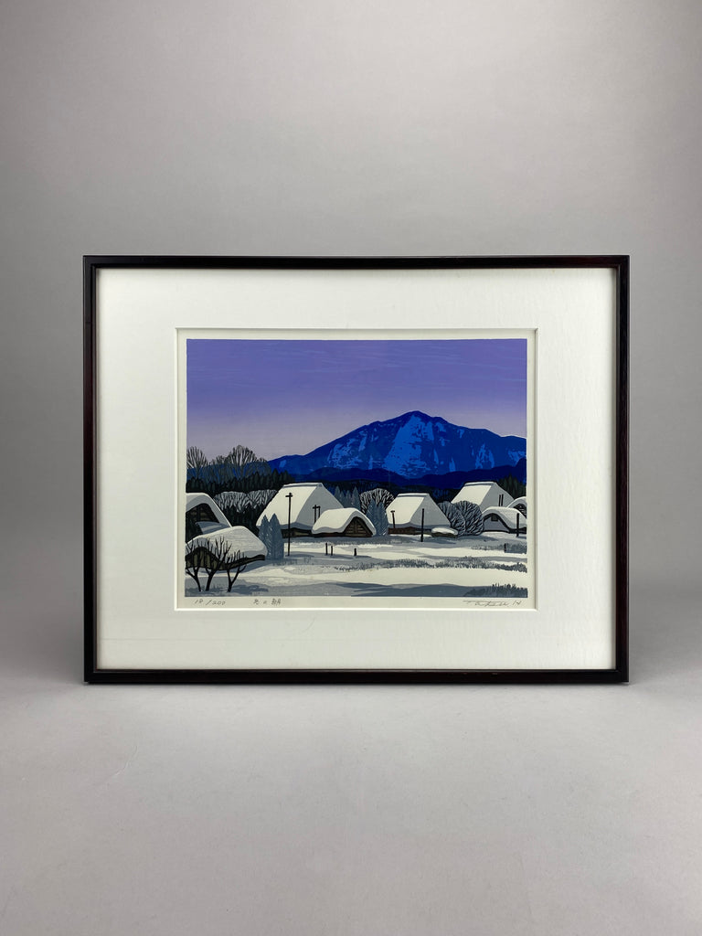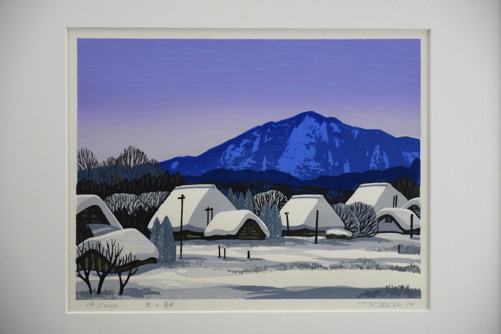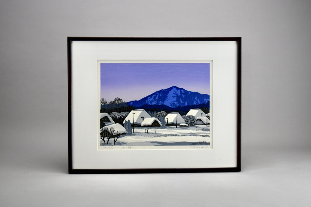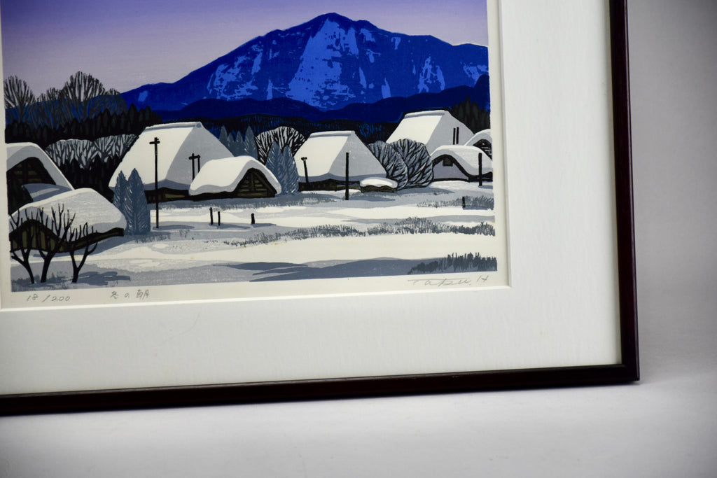 Immerse yourself in the tranquil beauty of Shirakawa-go with this exquisite Japanese woodblock print titled "Winter Morning" by the acclaimed artist Taku Harada. This stunning artwork captures the serene, snow-covered landscape of one of Japan's most picturesque villages, renowned for its unique Gassho-style farmhouses.