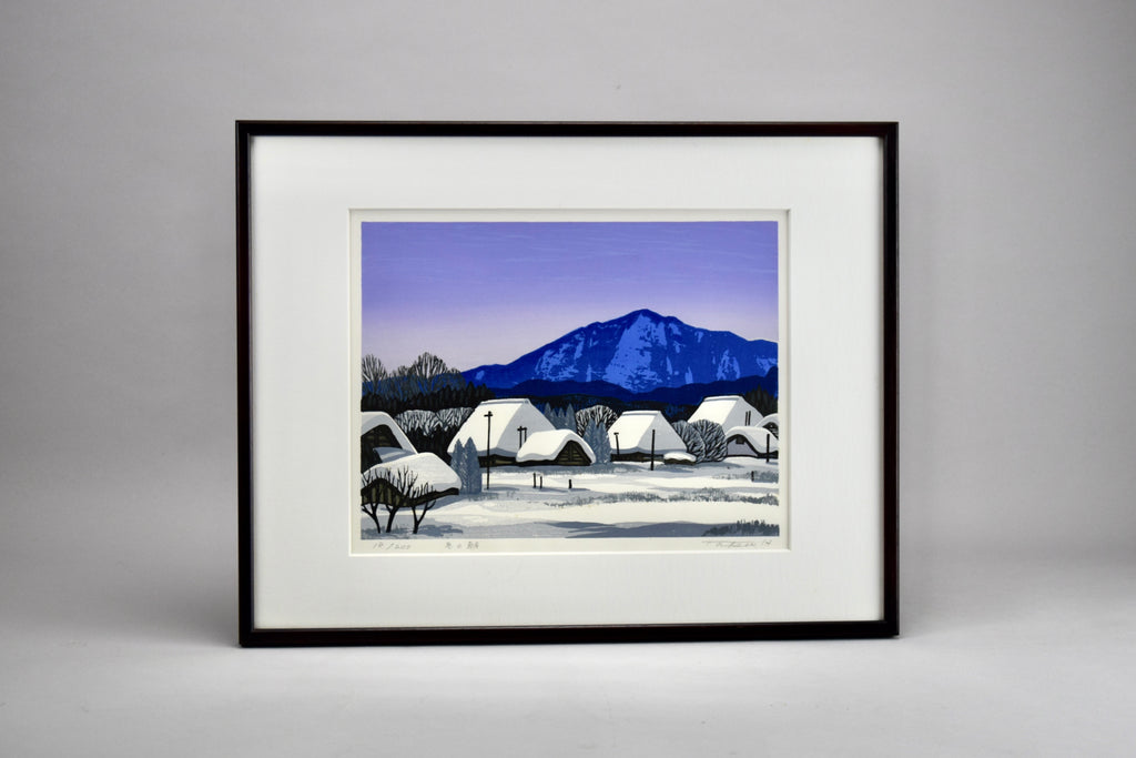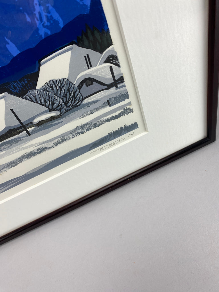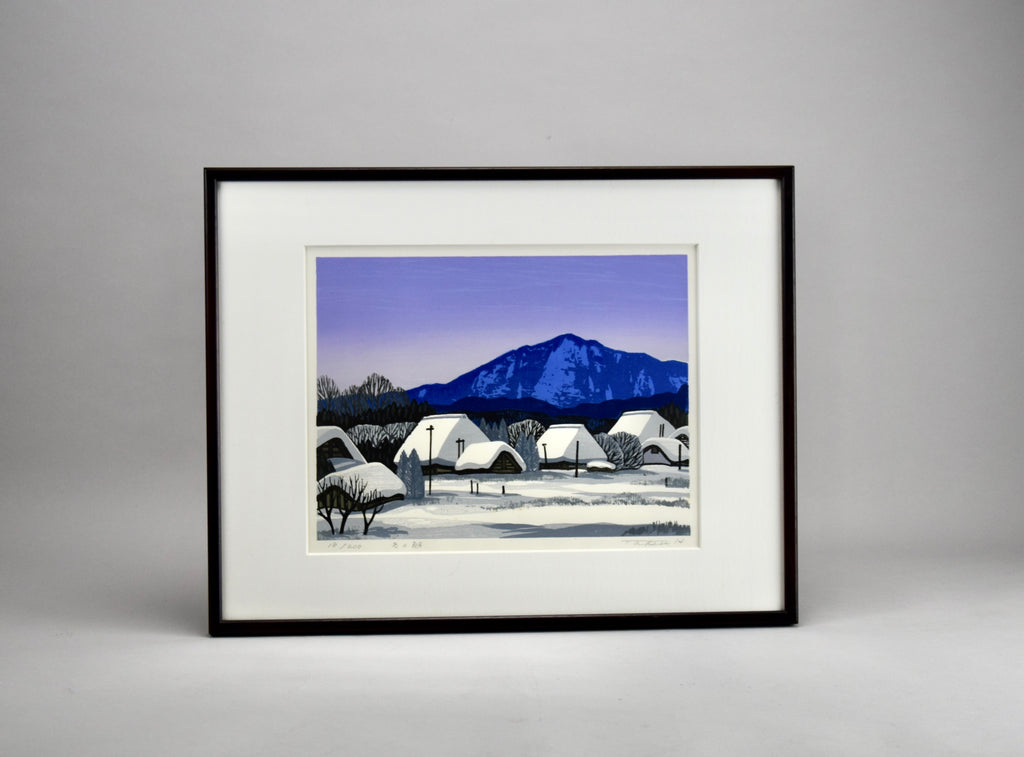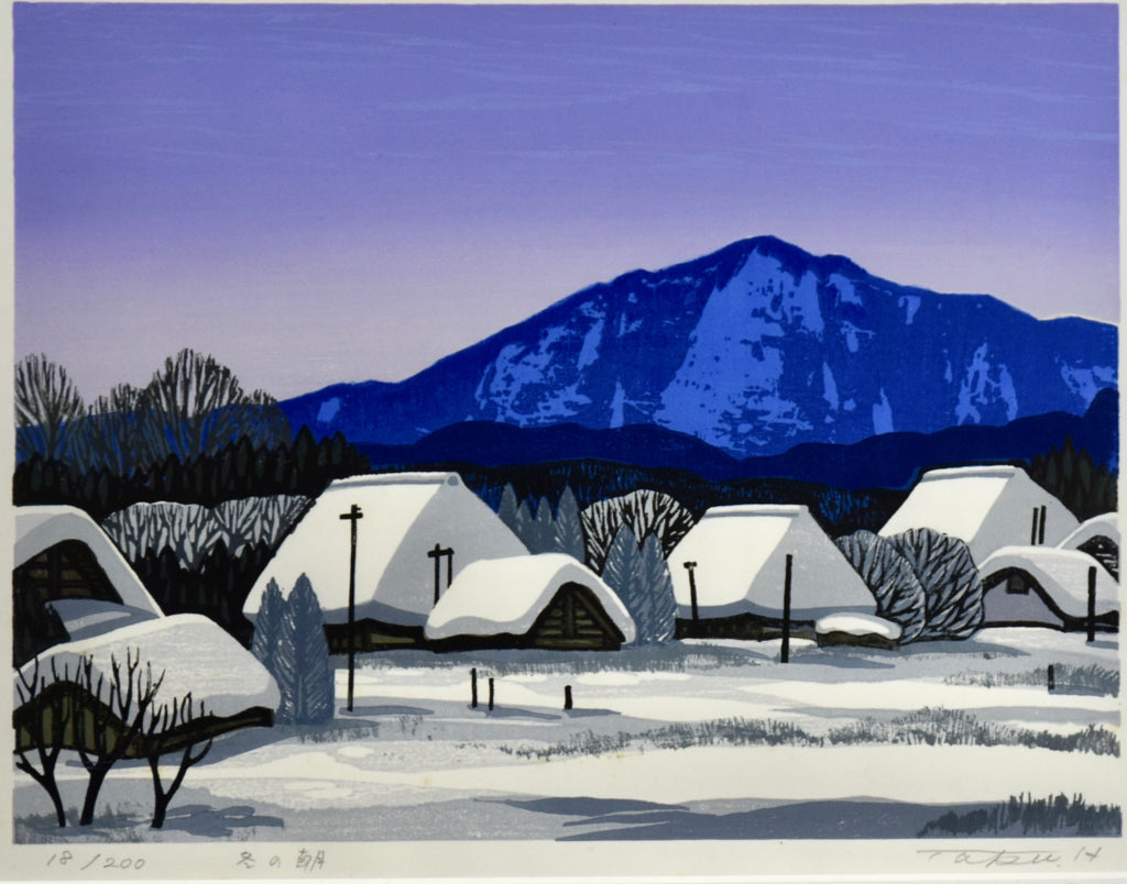 Immerse yourself in the tranquil beauty of Shirakawa-go with this exquisite Japanese woodblock print titled "Winter Morning" by the acclaimed artist Taku Harada. This stunning artwork captures the serene, snow-covered landscape of one of Japan's most picturesque villages, renowned for its unique Gassho-style farmhouses.
