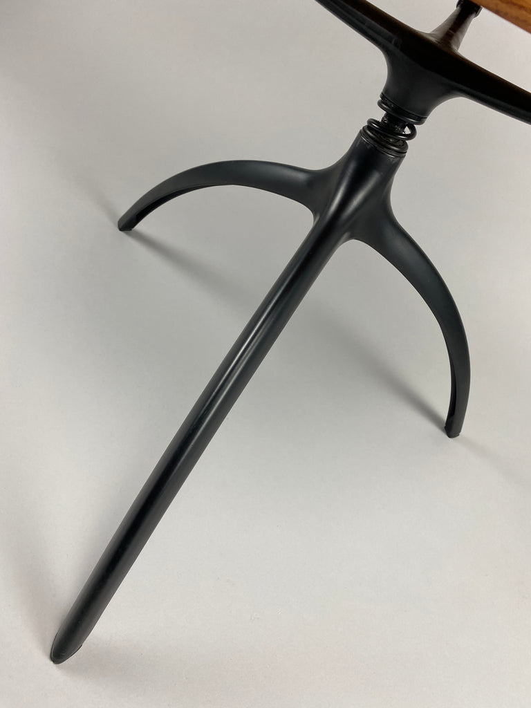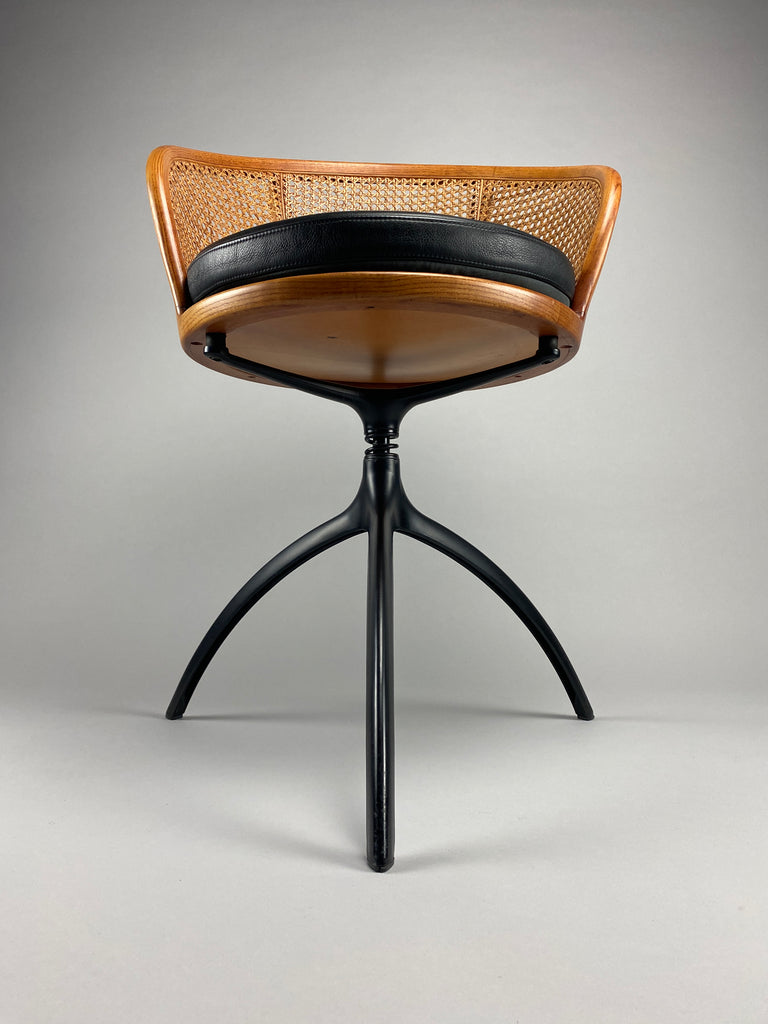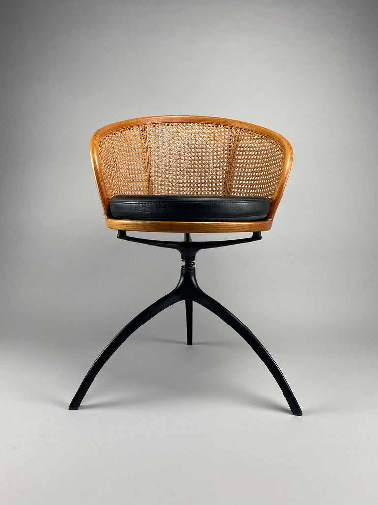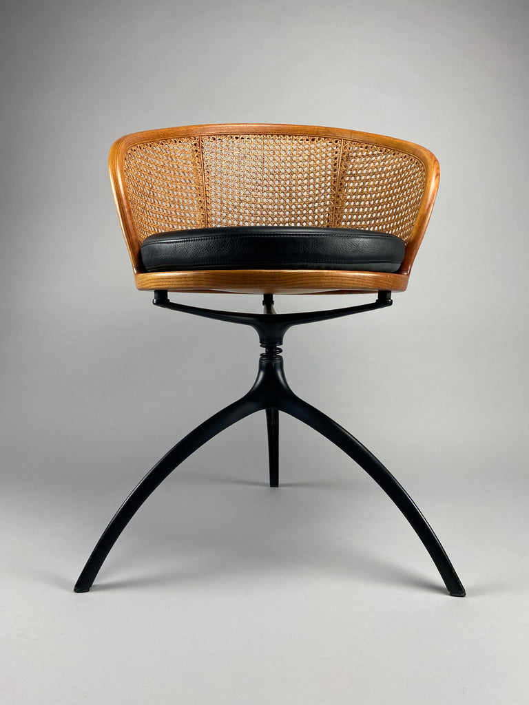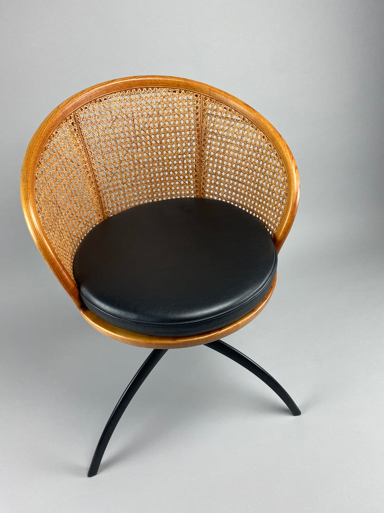 The 'Young Lady Chair' is a testament to Rizzatto's design philosophy, boasting a harmonious blend of form and function. The sleek black leather upholstered seat provides sumptuous comfort, while the Viennese cane back adds a touch of refinement and texture. The structure, crafted from black lacquered aluminum, exudes durability and sophistication, ensuring both style and stability for years to come.