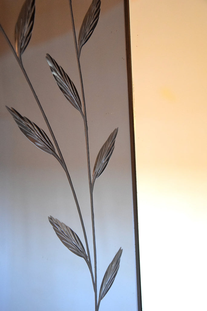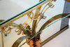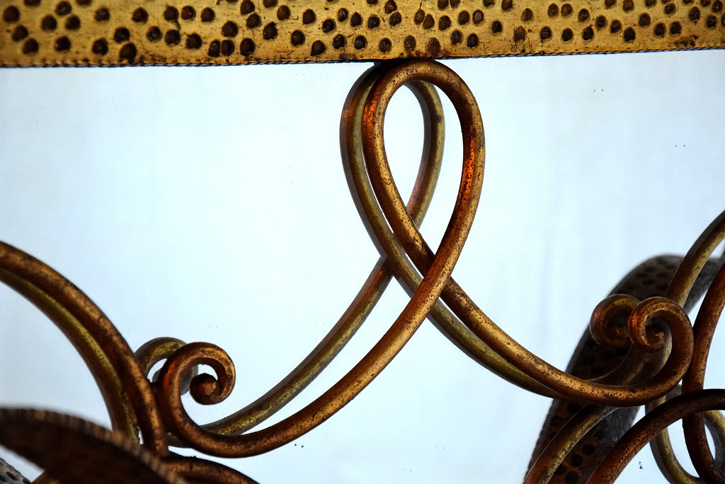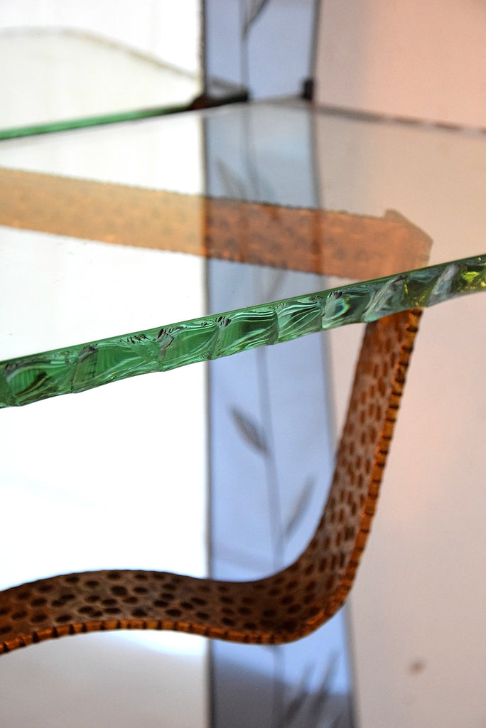This stunning piece exemplifies the elegance and craftsmanship of postwar Italian design. The mirror features a gently tapered form with beautifully beveled and etched smoked glass panels, delicately decorated with stylized leaf motifs, joined with brass rosettes. A floating glass shelf rests on a hand-forged, gilt wrought iron console characterized by intricate scrollwork and finely hammered textures, showcasing Colli’s sculptural approach to metalwork.