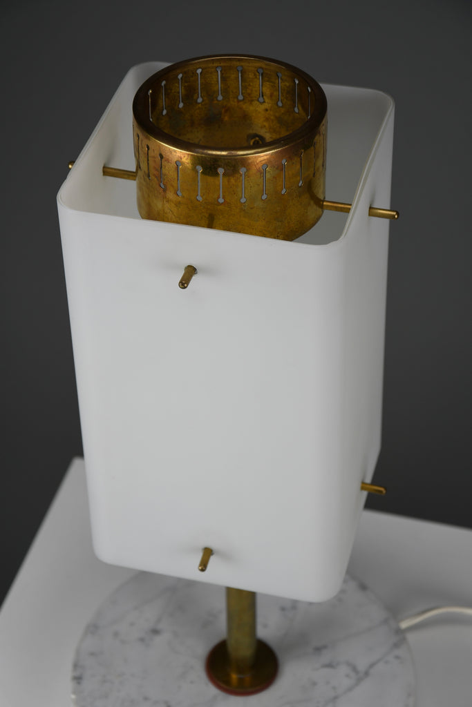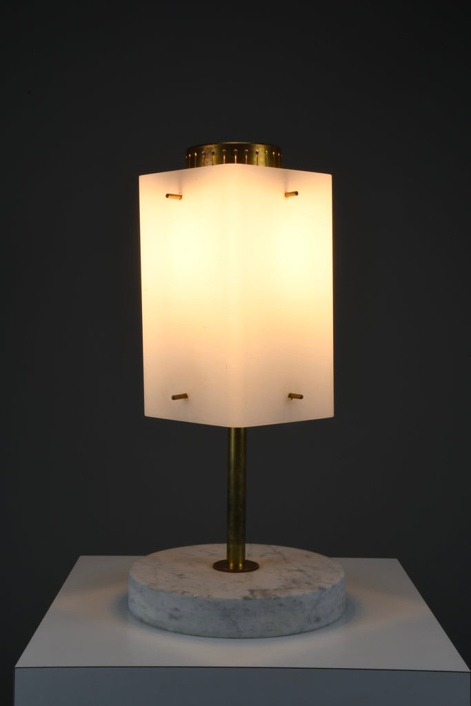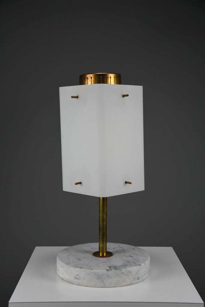 A striking Italian table lamp from the 1960s, attributed to Stilnovo. This elegant piece combines refined materials— a cylindrical Carrara marble base, a patinated brass stem and detailing, and a frosted glass diffuser held by brass pins. The geometric shade creates a soft, ambient glow when lit, highlighting the lamp’s sophisticated balance of form and function.