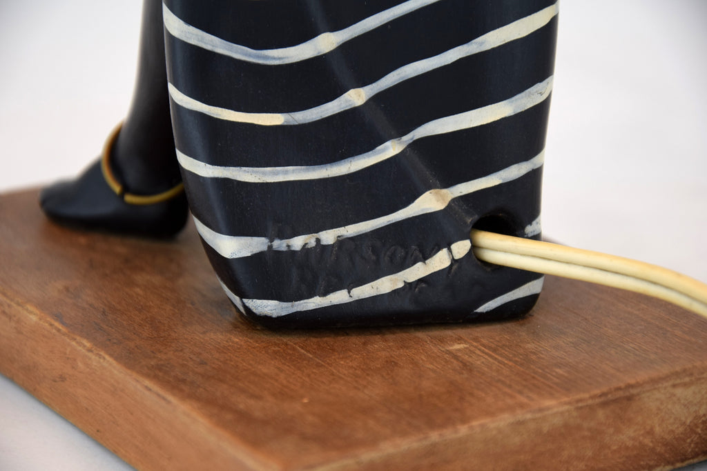 The lamp’s black satin glaze is beautifully contrasted by white striped detailing on the skirt and highlighted with subtle gold accents. Retains its original hand-painted features, including the red lips and gold hoop earrings typical of Barsony’s stylized figures. The cream pleated shade complements the soft curves of the ceramic form, casting a warm, ambient glow.