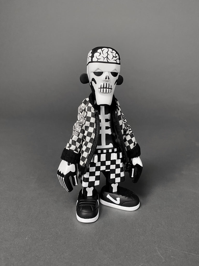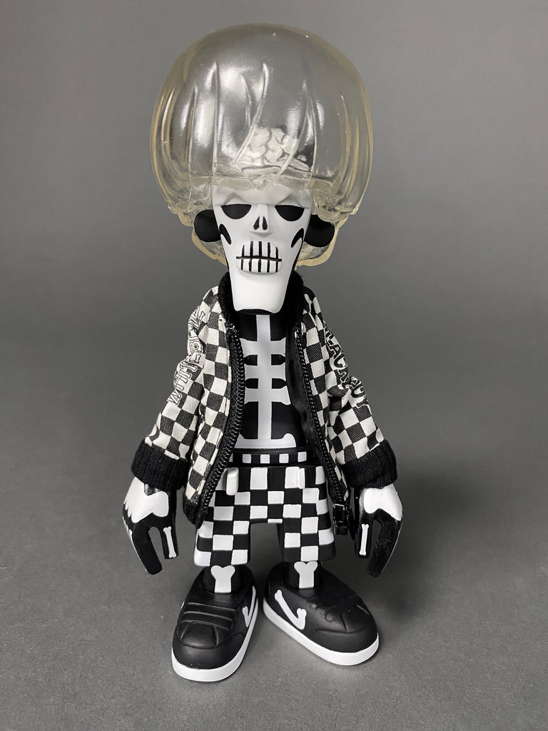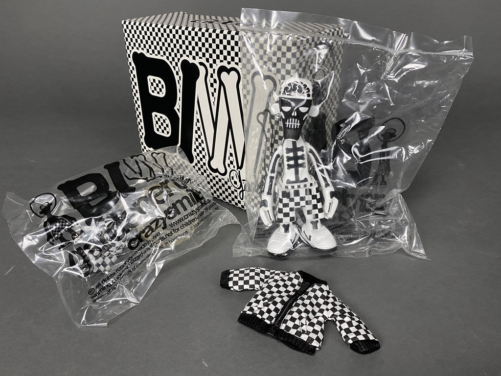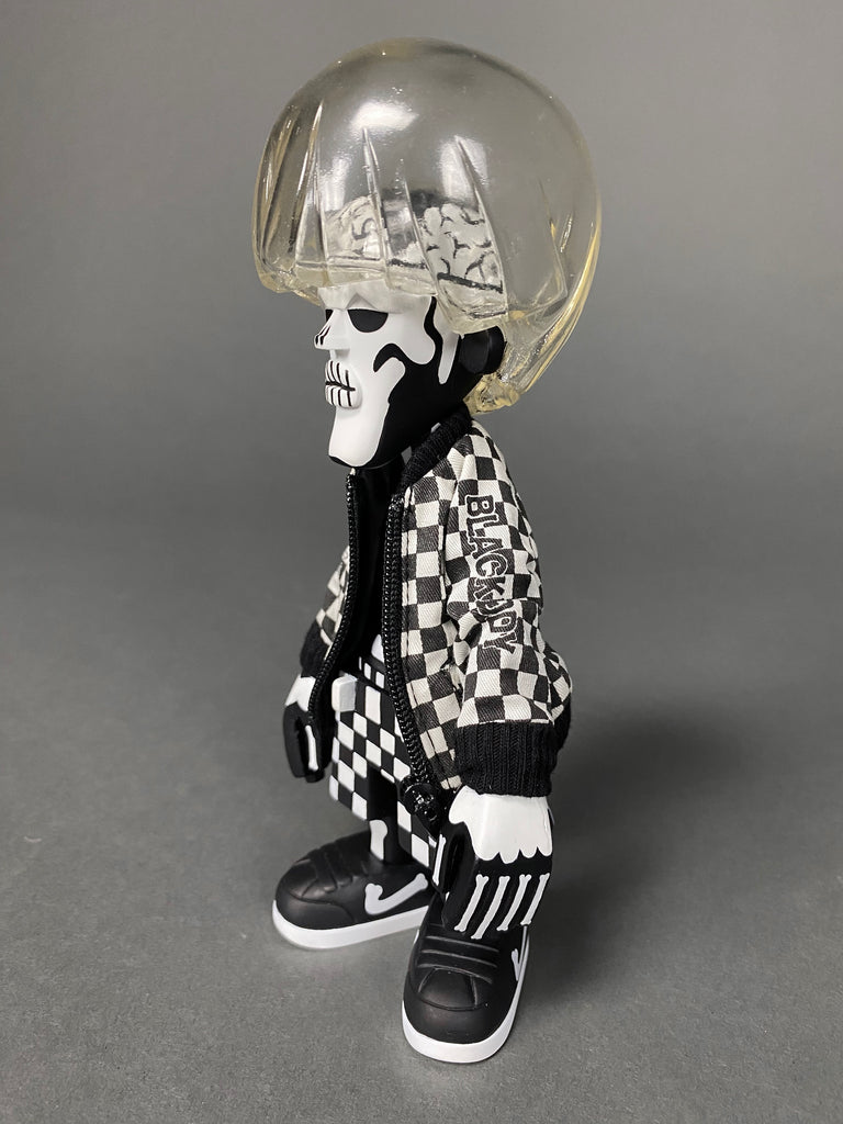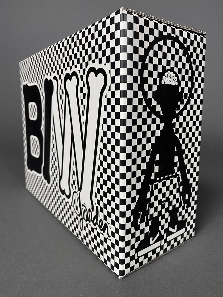 Black Body / White Bone Designer Toy by Michael Lau produced by Crazy smiles 2006. This rare piece comes with it's original box. baseball cap, jacket and transparent hair all in great condition. B/W Bone has never been exposed, always kept in storage, out of sunlight in a smoke free environment.
