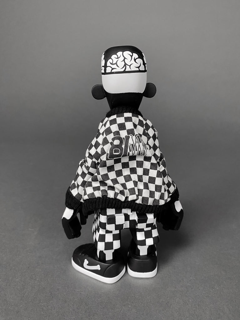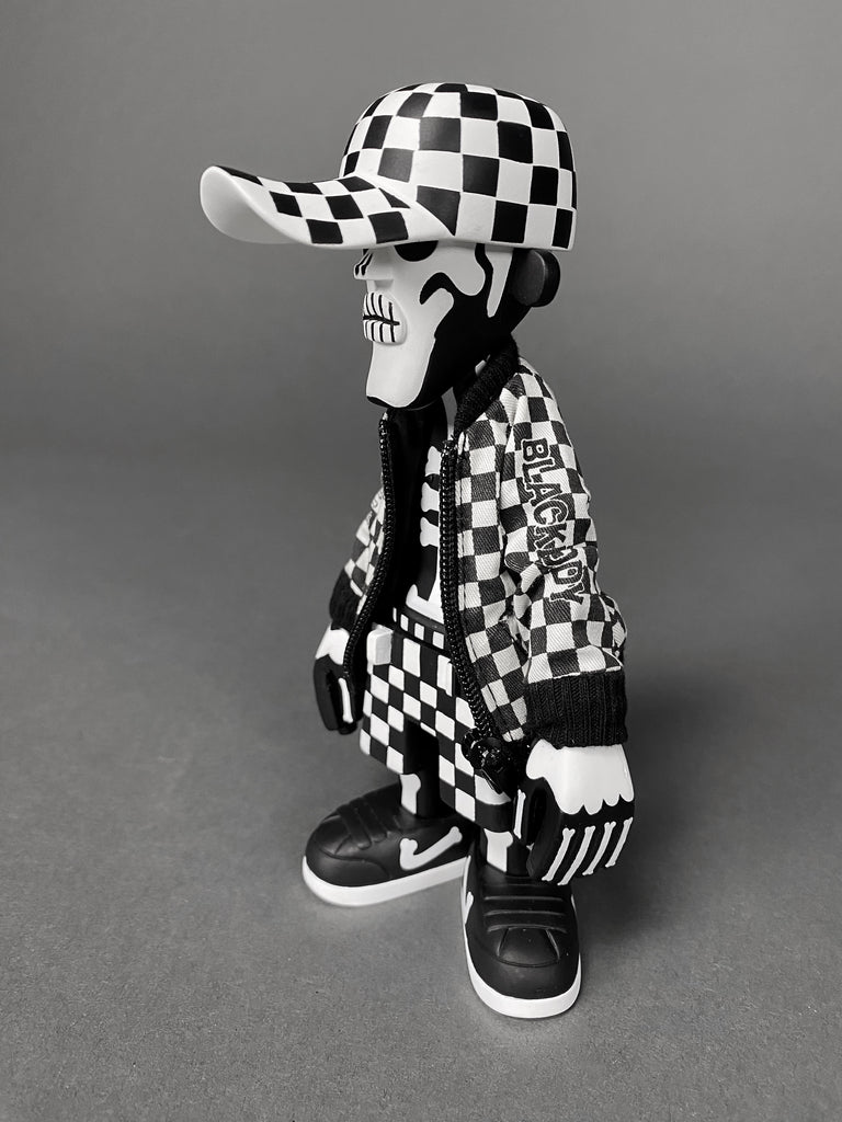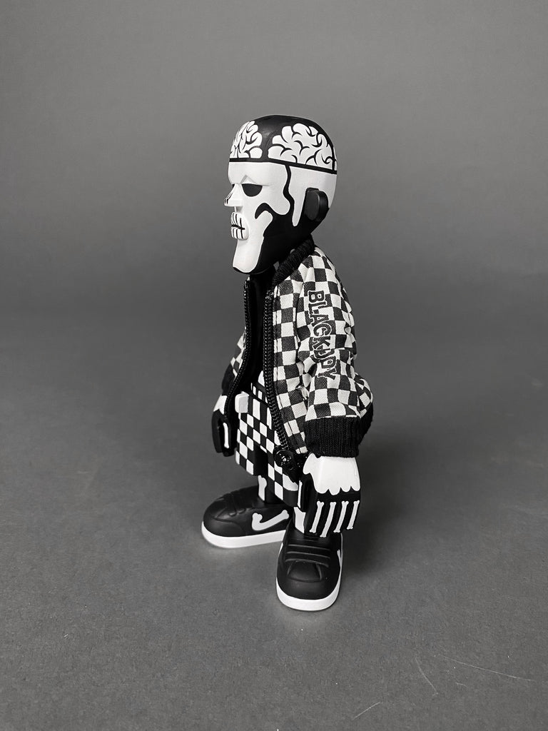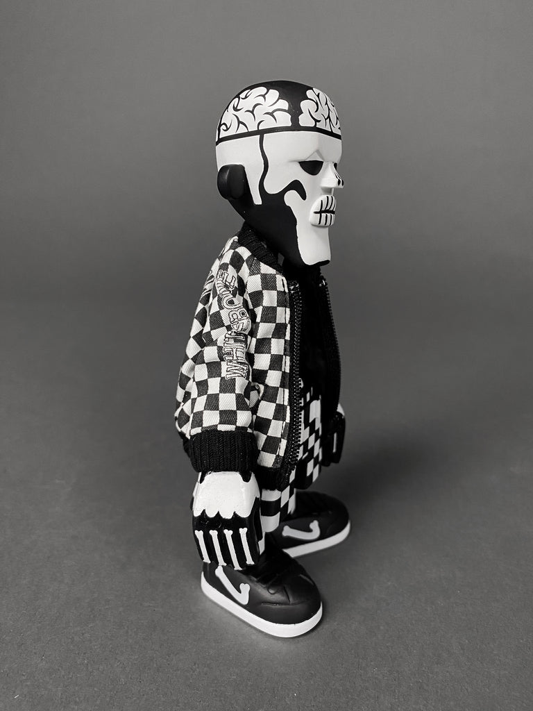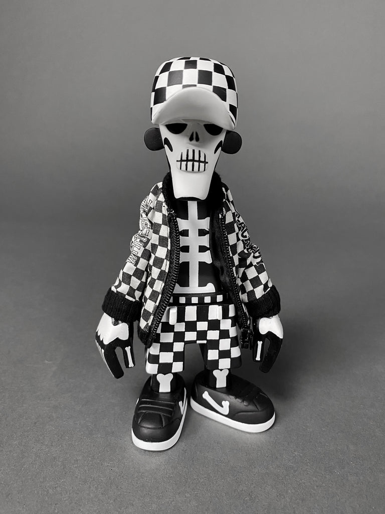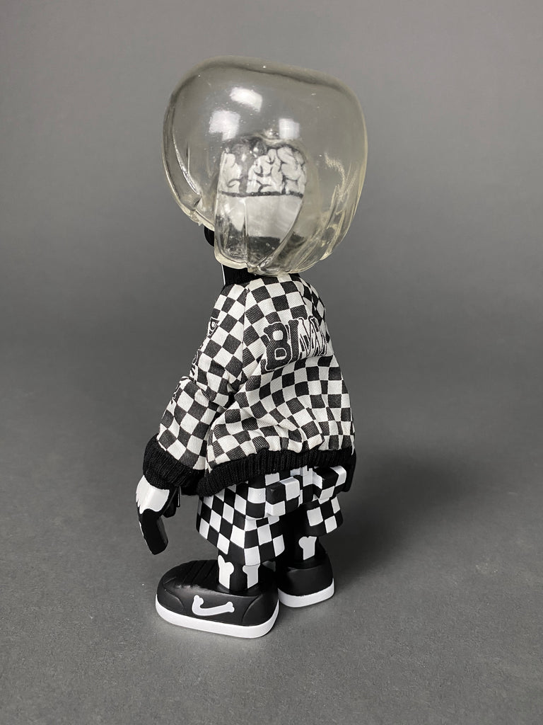 Black Body / White Bone Designer Toy by Michael Lau produced by Crazy smiles 2006. This rare piece comes with it's original box. baseball cap, jacket and transparent hair all in great condition. B/W Bone has never been exposed, always kept in storage, out of sunlight in a smoke free environment.