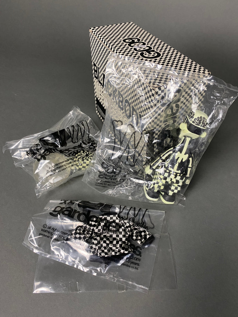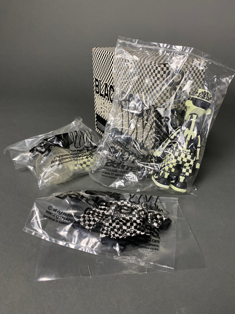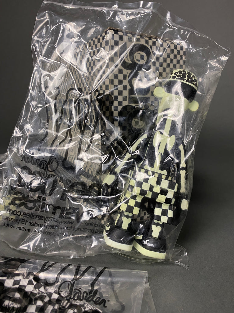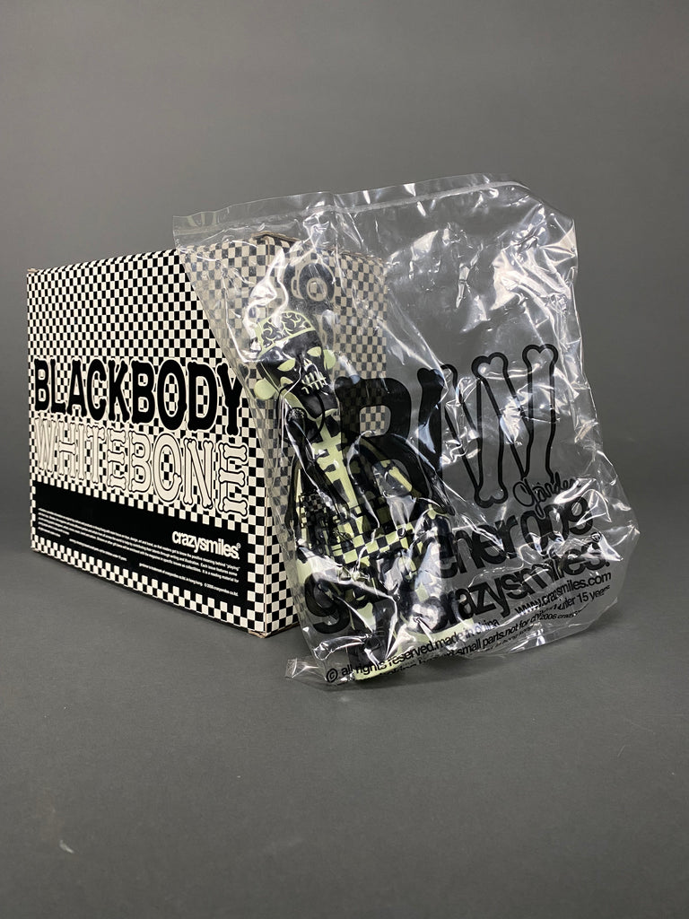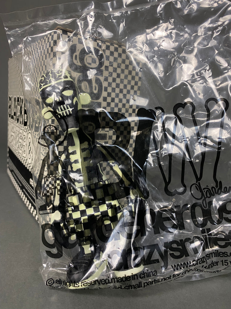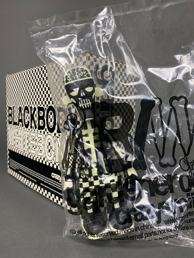 Rare GLOW in the dark Black Body / White Bone Designer Toy by Michael Lau produced by Crazy smiles 2006. This rare piece comes with it's original box. baseball cap, jacket and transparent hair all in great condition. B/W Bone has never been exposed, always kept in storage, out of sunlight in a smoke free environment.