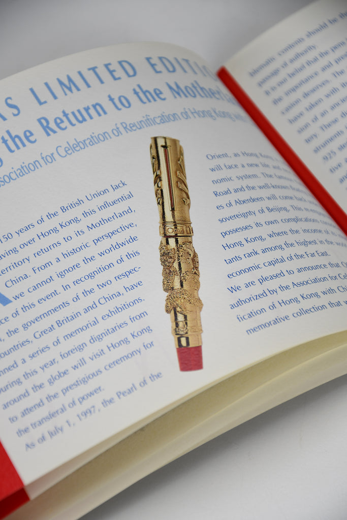Created for the historic 1997 reunification, the Return to the Motherland embodies both political and cultural symbolism: heritage (silk + Great Wall), prosperity (dragon), and the living spirit of Hong Kong (dolphins). Few writing instruments were designed with this level of narrative intention — even fewer in solid 18K at a global edition of 200.