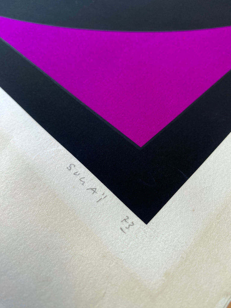 Kumi Sugai was a Japanese painter. Best known for his Minimalist and Hard Edge geometric abstractions, Sugai was influenced by the relationships between Japanese calligraphy and Western typography. His paintings often featured a singular, centrally placed shape and a highly graphic aesthetic. Born in Kobe, Japan on March 13, 1919, he developed an interest in art a young age, initially enrolling at the Osaka School of Fine Arts in 1933 and later dropping out to work in commercial advertising during the Second World War. By 1952, Sugai settled in Paris, where he studied at the Académie de la Grande Chaumiere and absorbed contemporary Western painting styles, including Abstract Expressionism and, later, Minimalism and Pop Art. At first, Sugai adopted traditional ukiyo-e woodblock techniques, using bright colors to create prints infused with avant-garde art influences. In the 1960s, however, he transitioned into painting and printing more geometric images of letters and directional signs. Before his death on May 14, 1996 in Kobe, Japan, Sugai achieved international success, participating in the Pittsburgh International five times between 1955 and 1970, and holding a major retrospective of his work at the Seibu Museum of Art in Tokyo in 1983.