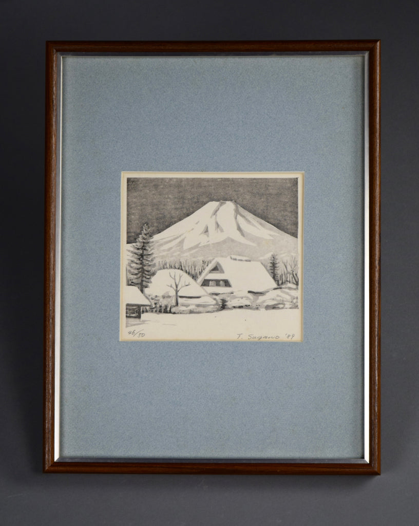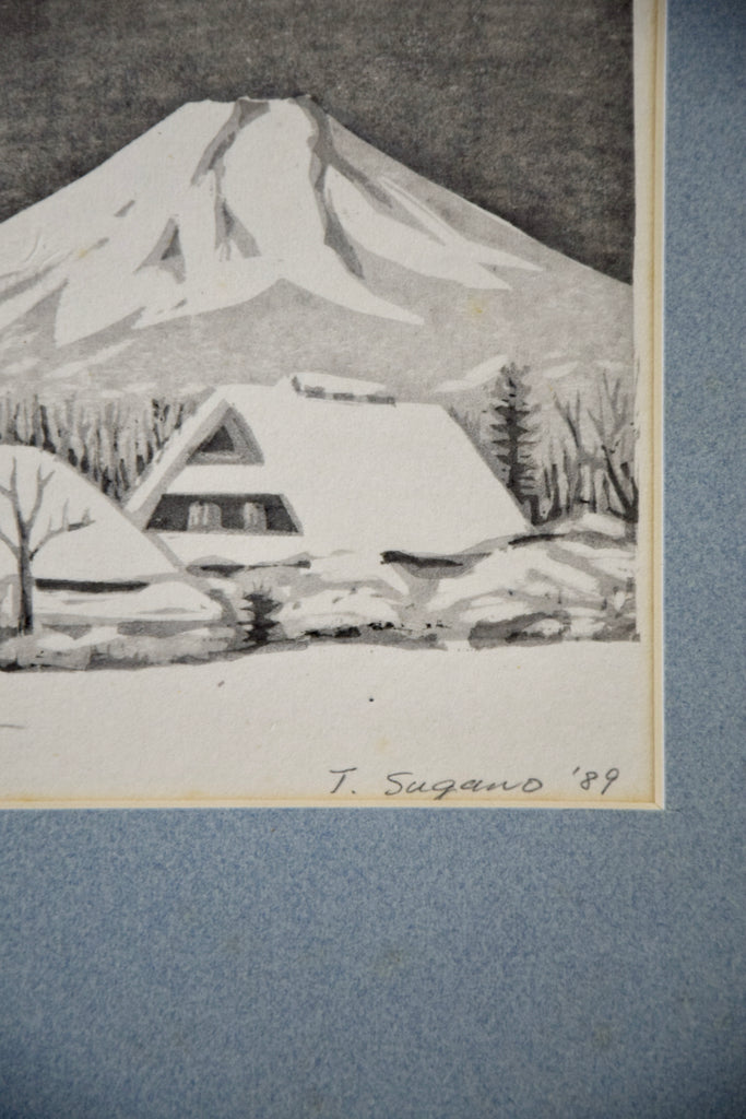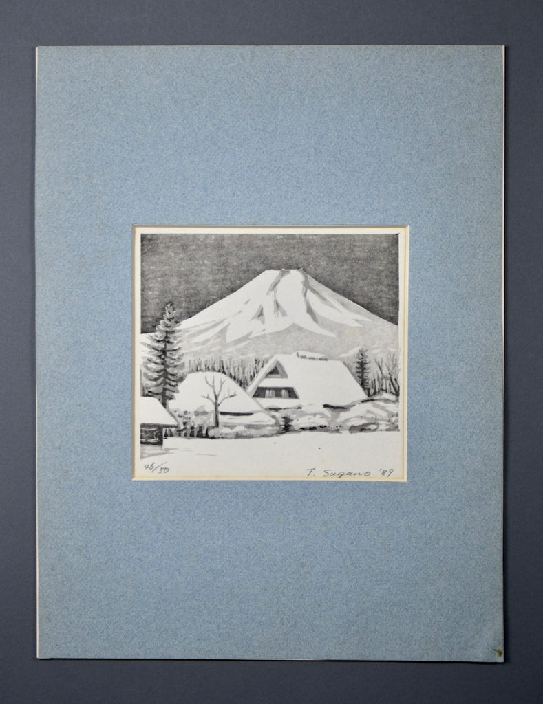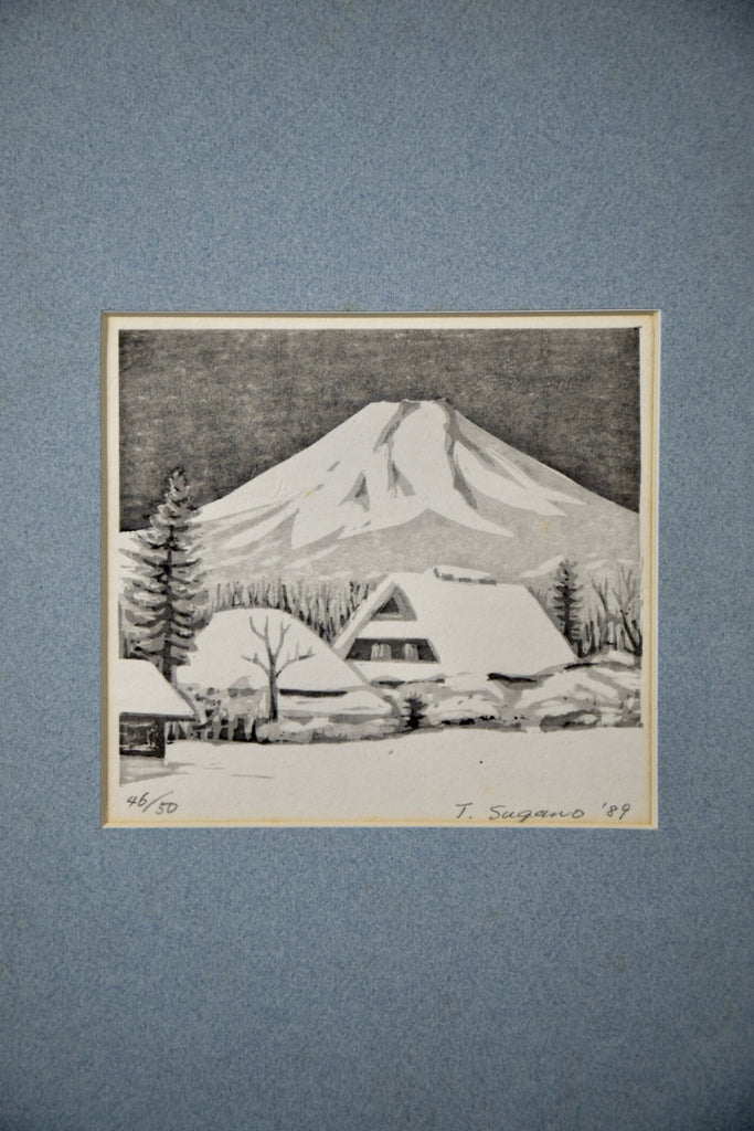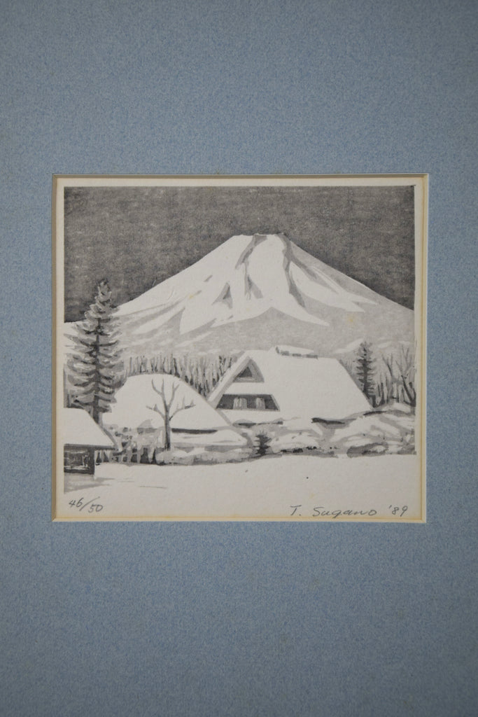 Embrace the timeless beauty of Japan's winter wonderland with this limited-edition woodblock print, skillfully crafted by renowned artist T. Sugano in 1989.
